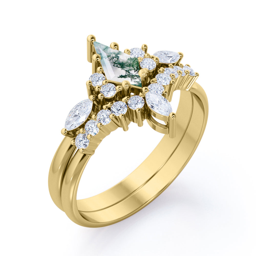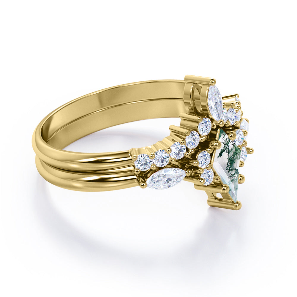 Crowned Quadrilateral 1.25 carat Moss Agate and Moissanite Bridal Ring Set in white Gold combines all the good meanings you might want to let her know. The perfect Moss agate engagement ring features 0.85 carat kite Moss agate in the center and adorned 0.25 carat round and marquise shaped Moissanite along the shank. 7 stones represents good luck that you wish for her in everyday. Each stone is stacked next to each other, glistening the ring band. Moissanite contoured wedding band are designed and destined to be a crown princess ring, which will let her know that she is your princess and how much you adore her. Paved Moissanite enhances the sparkle of the rings and tells her that she is the brightest light in your life. Don't miss a chance to propose to her with the most beautiful and meaningful ring. This well crafted jewelry comes in 18k gold over silver, 10k gold, 14k gold and 18k gold in white, rose, yellow and black gold. The ring comes with 30 days full refund policy and one free resizing within 30 days upon receipt of the item.
