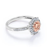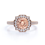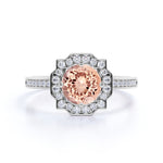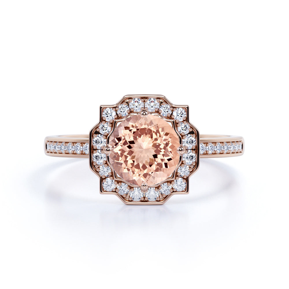 Designer 1.25 Carat Round Cut Peach Morganite and Diamond Halo Engagement Ring in Rose Gold