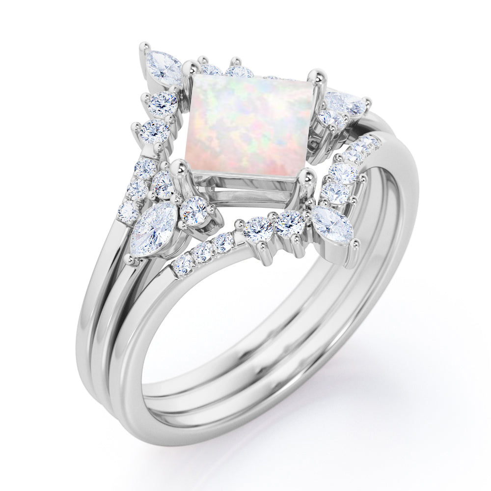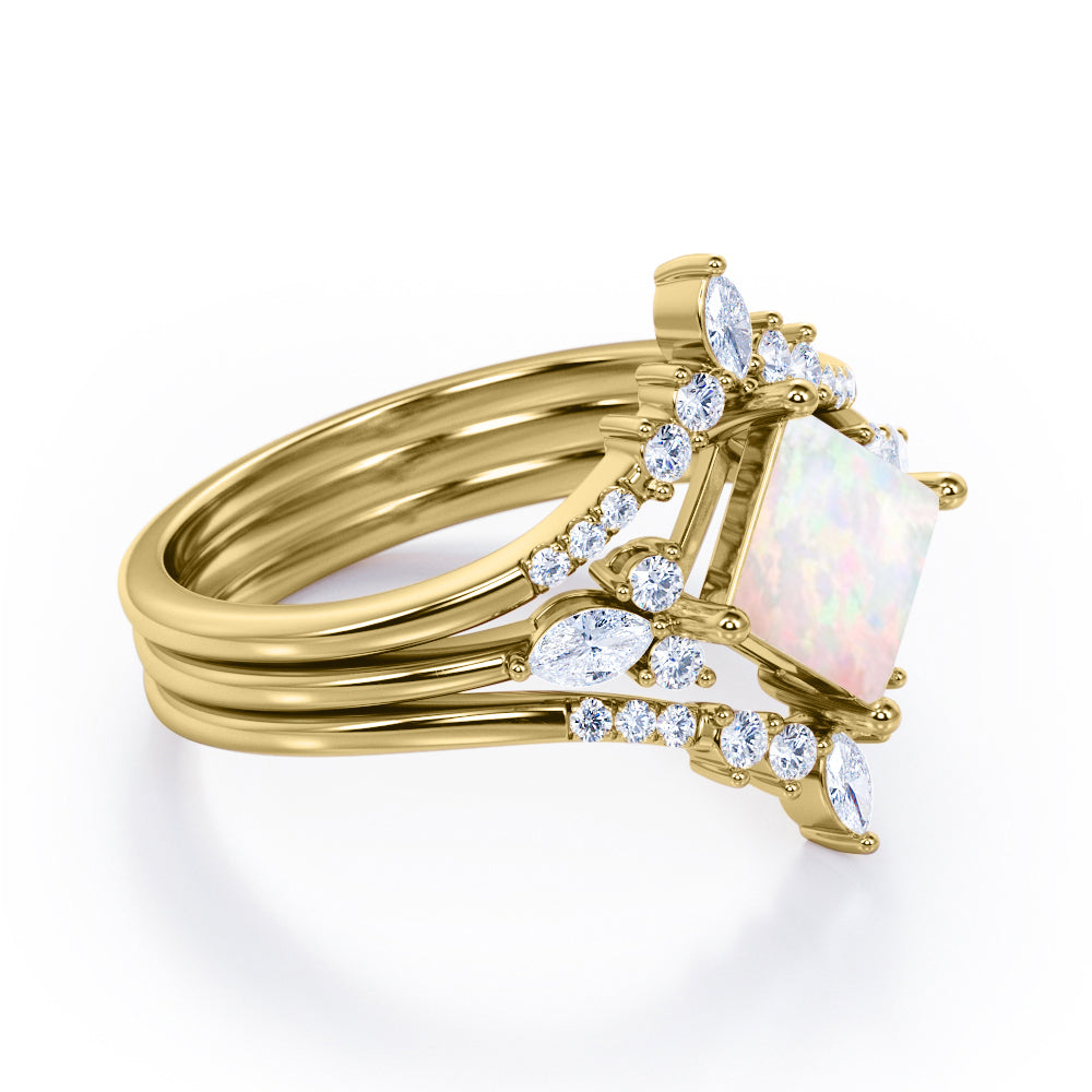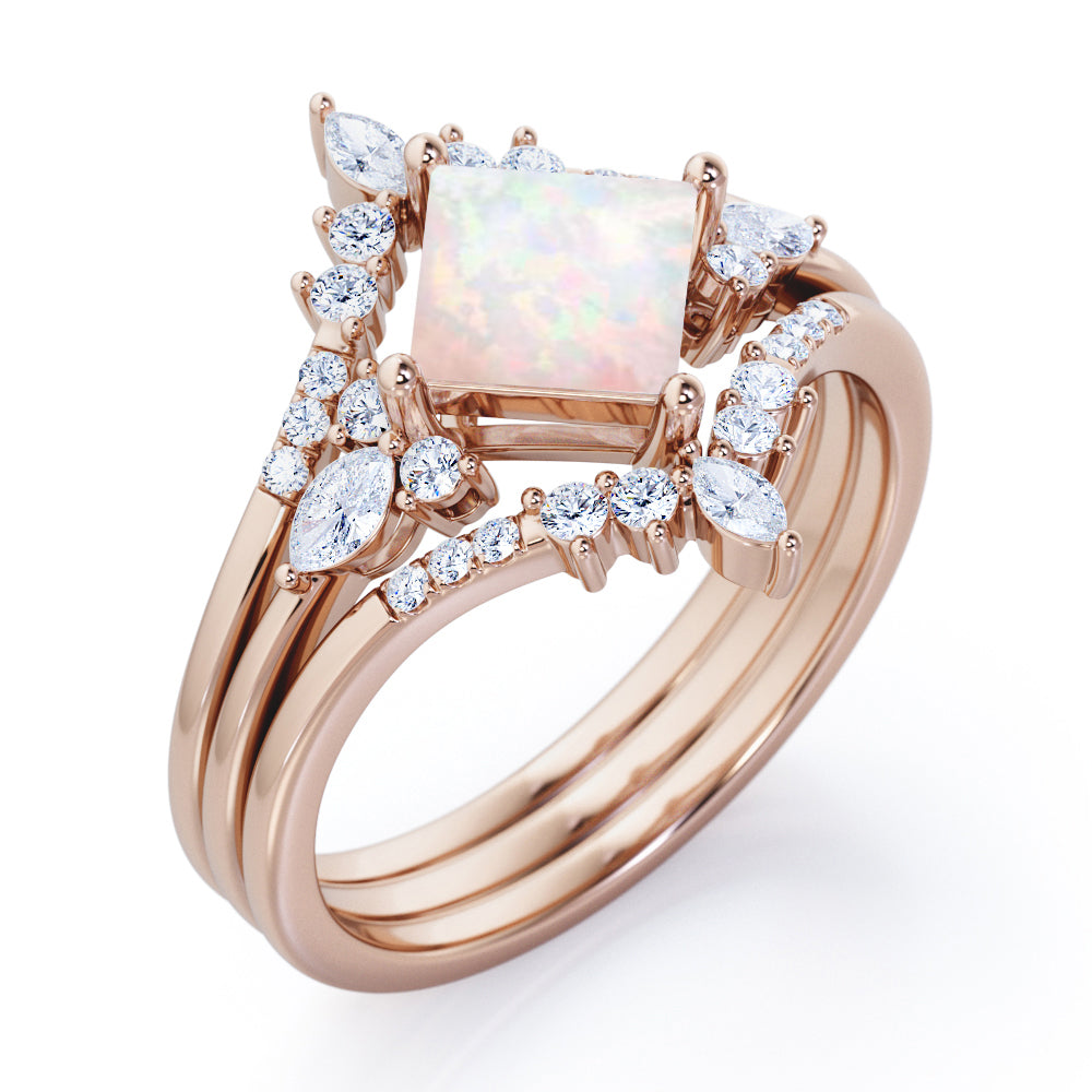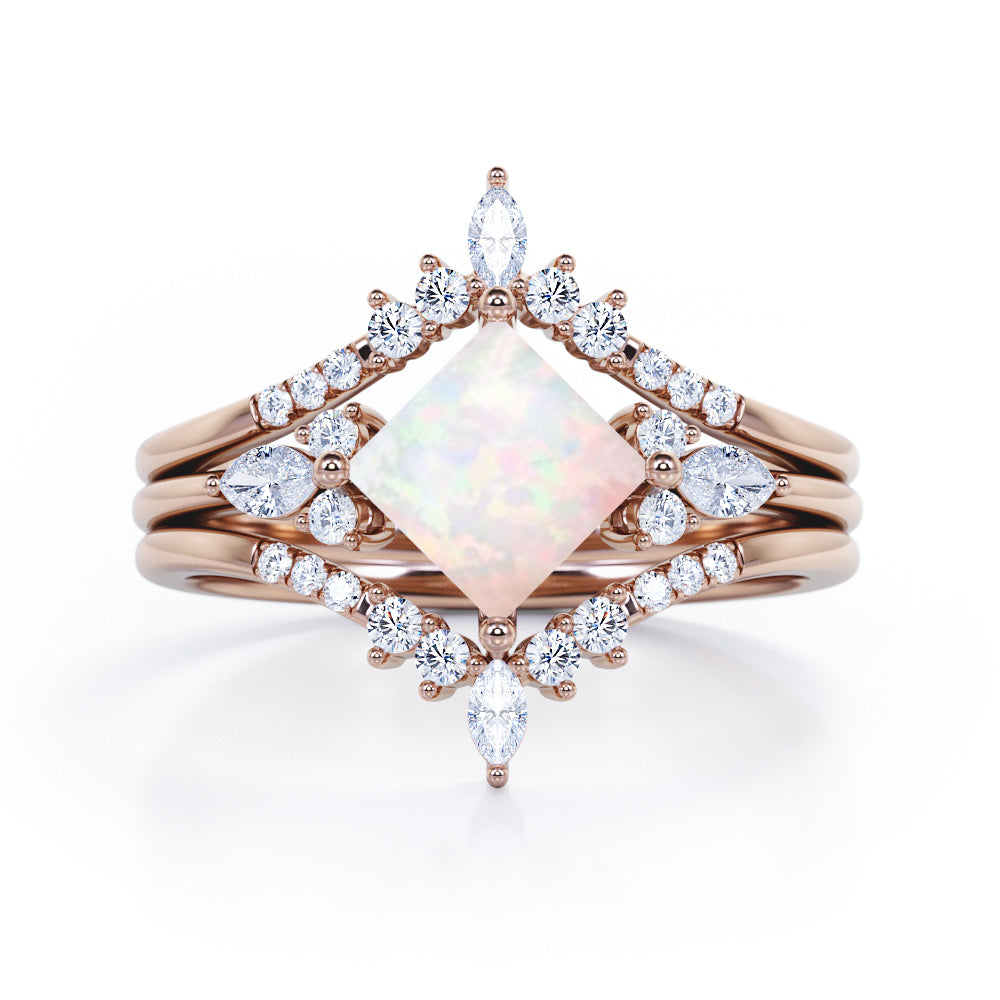 Get glamorous with the Double Crown 1.25 carat Princess Lab Opal and Diamond Trio Ring Set in Rose Gold. The trilogy set contains one seven stone engagement ring along with twin V-shaped wedding band. The promise ring features a square cut Lab Opal in the center and flanked by two round diamonds on each side, follow by marquise diamonds in east-west setting. The chevron wedding bands that come pair with the proposal ring displays marquise diamonds at the top while dainty round diamonds stones cascade down the slope. Once the rings are worn together, it creates a picture of center stone that is shining like a bright star. This trio wedding set would be a perfect gift for your special someone to let them know that they are the light in your life. The ring comes at a very affordable and can be made in either 18k gold over silver, 10k gold and 14k gold with the color of white gold, rose gold, yellow gold and black gold.