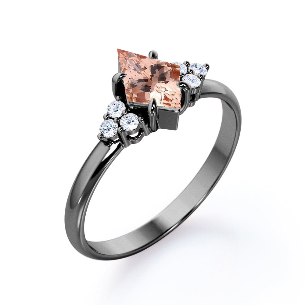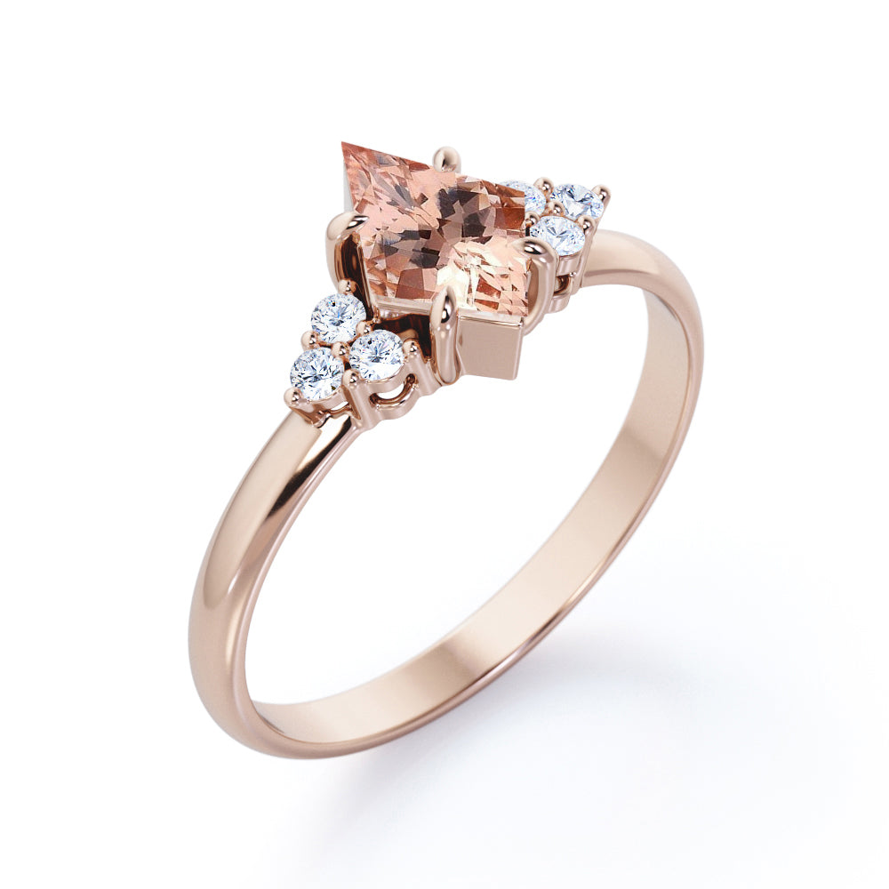 A 0.5 carat kite Morganite is placed between six round Moissanite on an Edgy 0.55 carat Kite Morganite and Moissanite Engagement Ring in Rose Gold. Three round petite Moissanite stones are flanked by the side Morganite and formed into triangle. Combine the clustered triangles with kite shape center stone, it makes the ring looks like a sparkling northern star. It can be a meaningful gift to your mom or lover that they are the light in your life that guide you to a better and happier path. This promise ring can be made in 18k gold over silver, 10k gold and 14k gold with the color of white gold, rose gold and black gold.