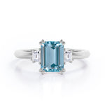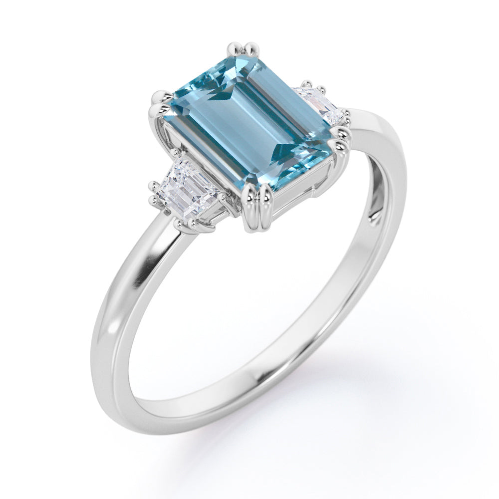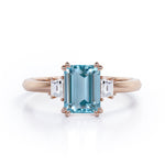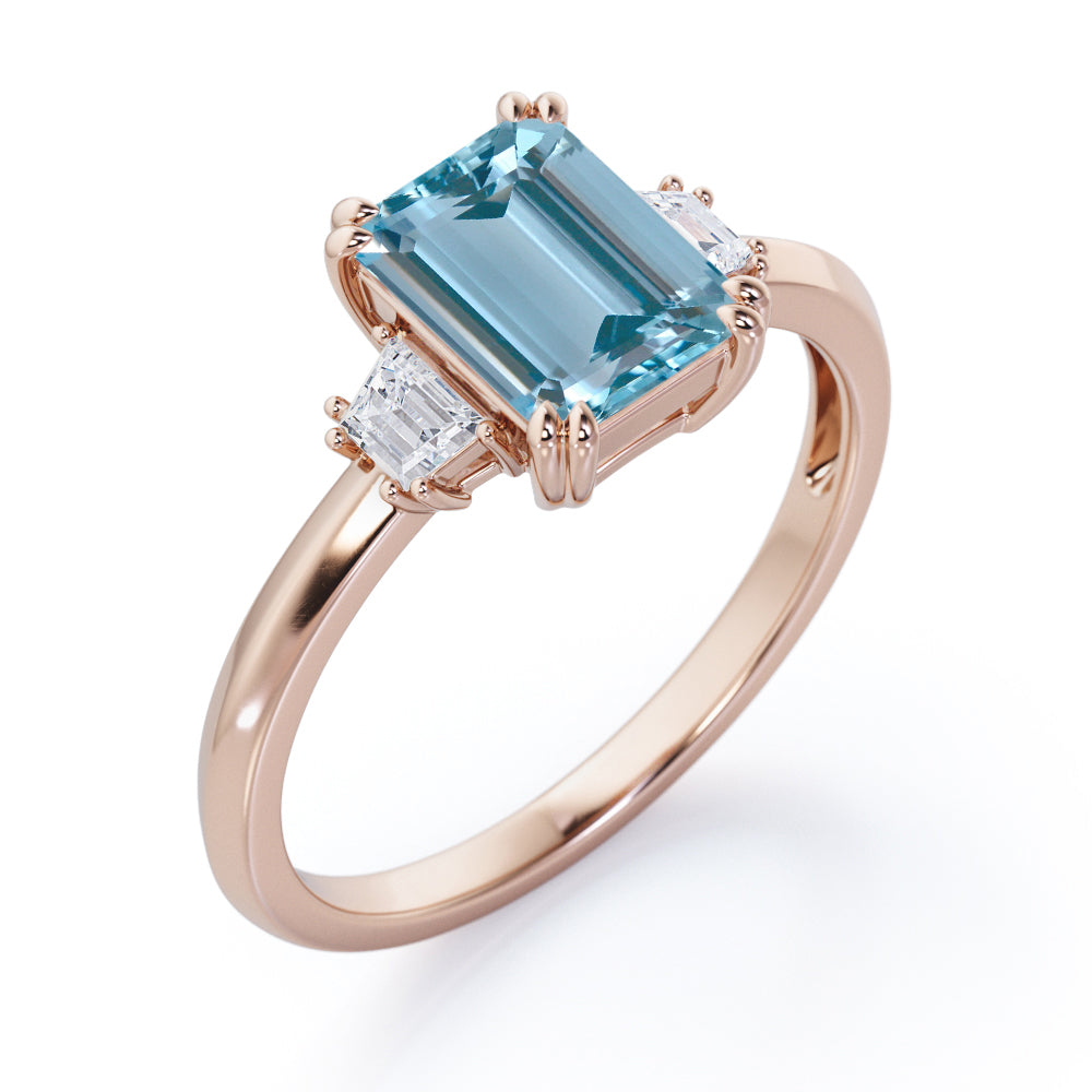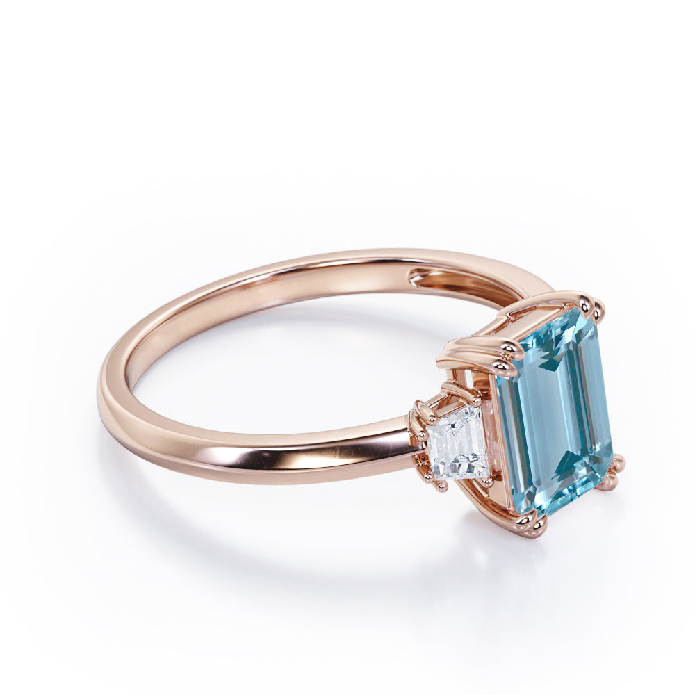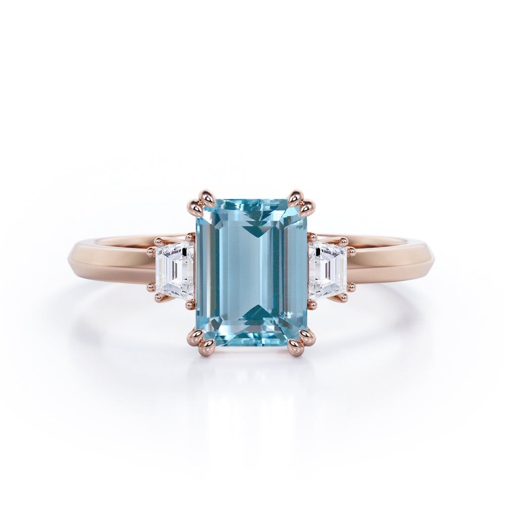 Eight Prongs 1.10 Carat Emerald Cut Aquamarine And Diamond Three Stone Engagement Ring In Rose Gold. Mixing stones of different cuts is a fun and unique way to make your ring stand out. This three stone ring does it subtly with one carat emerald cut and two baguette cut 0.10 carat side diamonds. With the center stone, just slightly larger, this three-stone engagement ring is both minimalistic and eye-catching. Set in a plain rose gold band, this ring will set all the eyes on you. Each stone is held firmly by the prongs which adds a touch of sophistication to this three stone engagement ring. The brilliant three stones in this divine ring also represents a couple's past, present and future. This eight prongs 1.10 carat emerald cut aquamarine and diamond three stone engagement ring in rose gold can also be customized into 18k gold plating over silver,10k Gold or 14k Gold as per your desired choice. Please note that if the ring is made over silver, the side stone will be moissanite and if it is made on gold, diamond will be employed as the side stone.