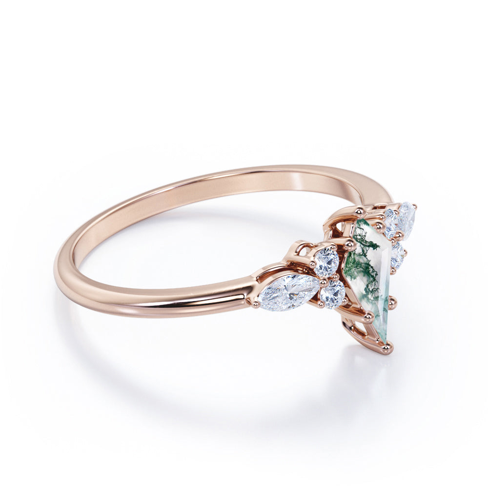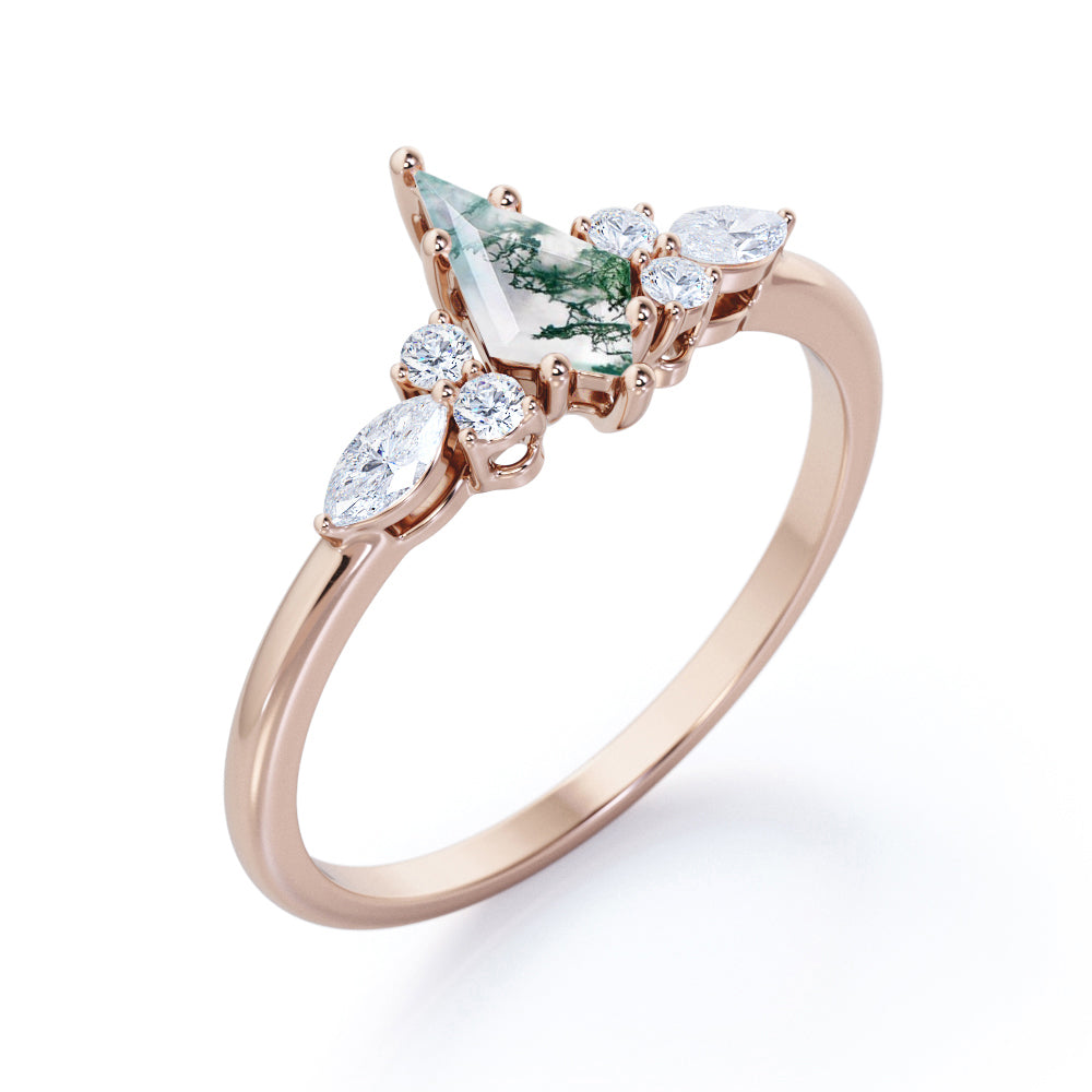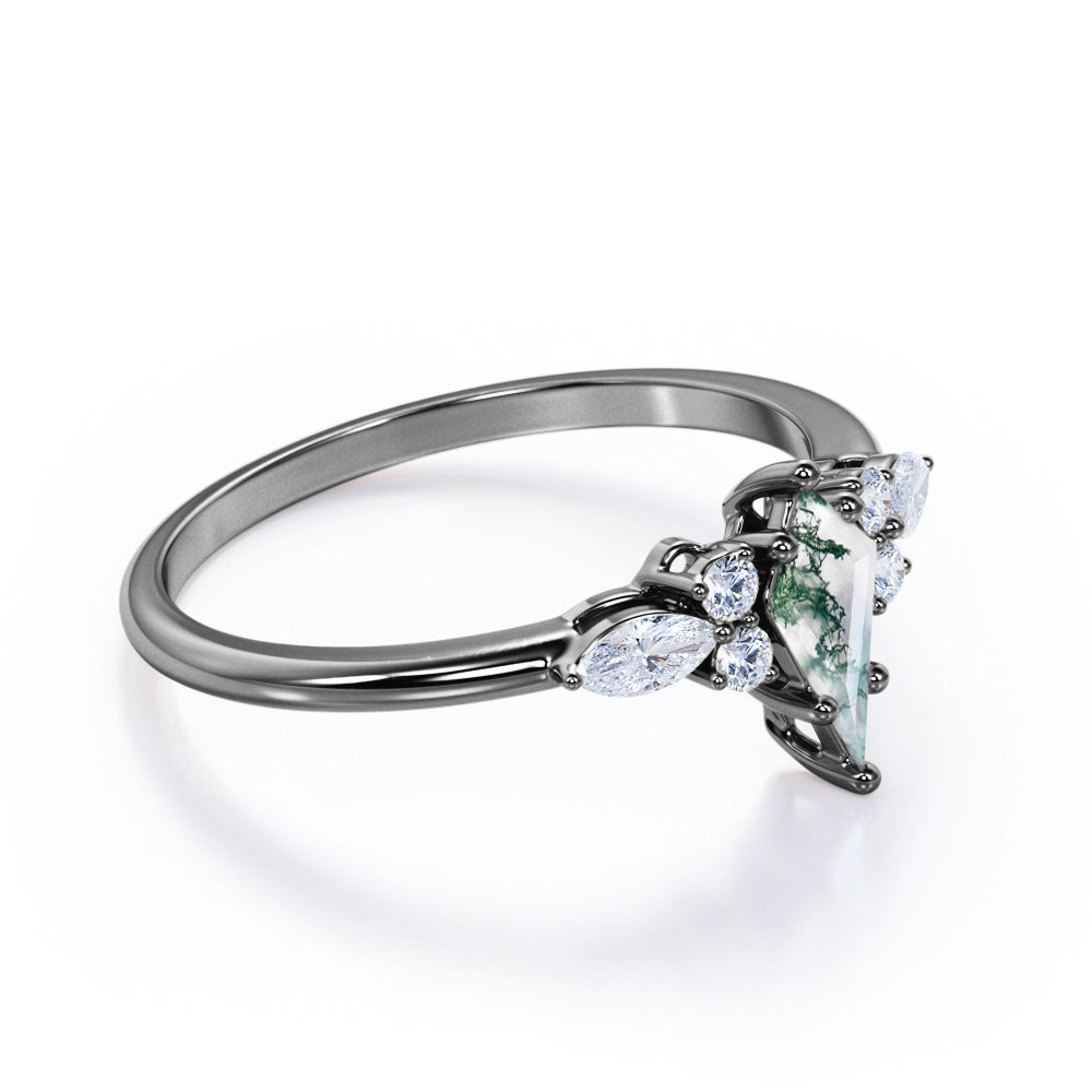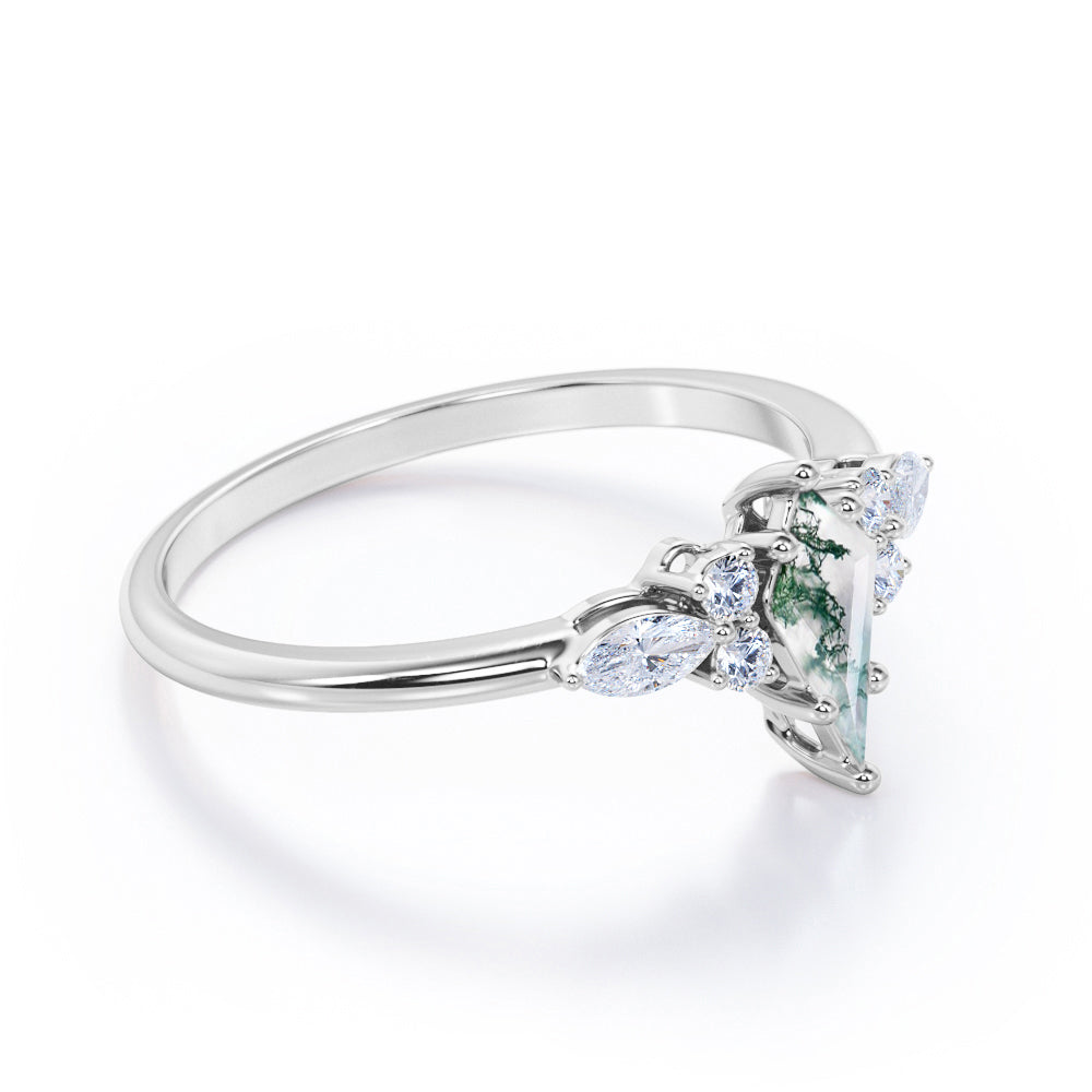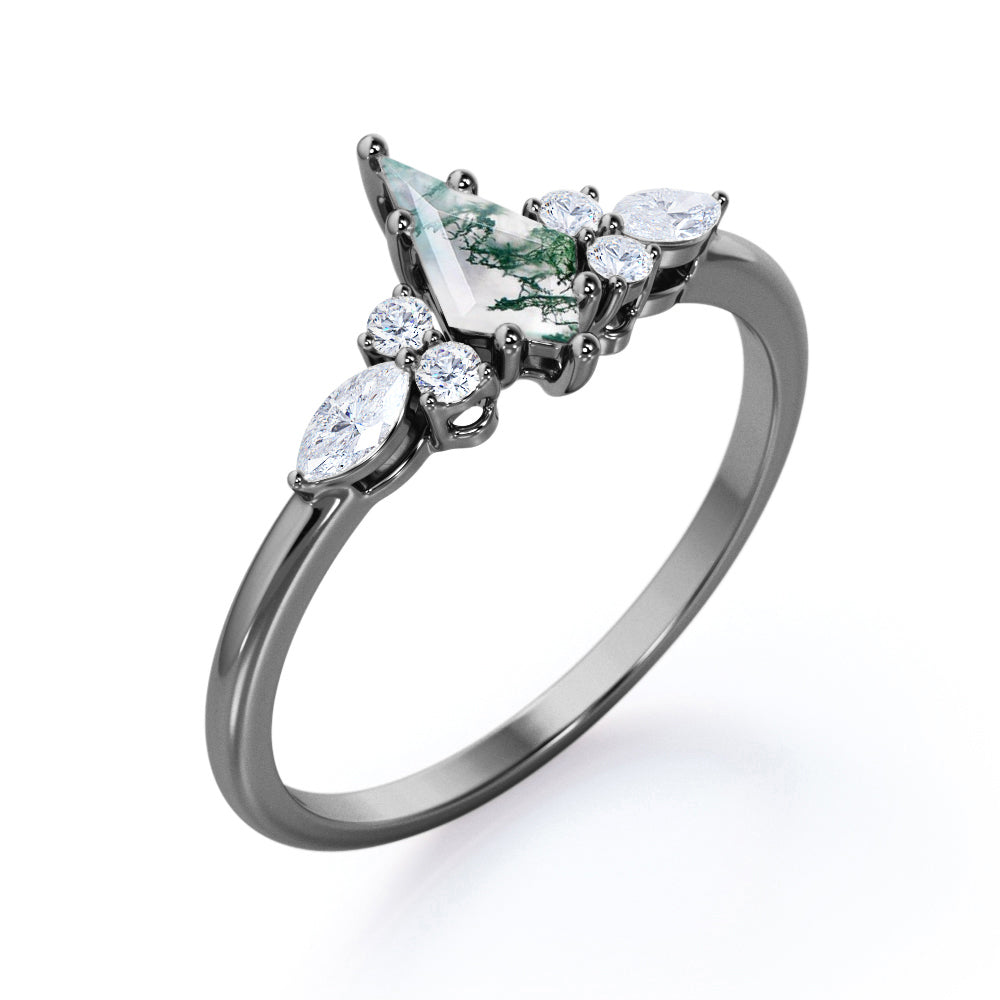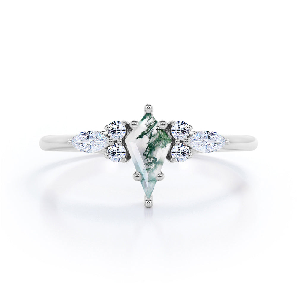 Healing and restoring your positive energy with Moss agate jewelry. Elegant 1 carat Kite Shaped Moss Agate and Moissanite Promise Ring in White Gold exudes 0.85 carat Moss agate and 0.15 carat Moissanite on the ring. Engagement ring presents step cut Moss agate as the center stone, it is delicately secured in 6 prongs. 18k gold over silver band is garnished with dazzling round and marquise Moissanite; 4 circles of Moissanite are located side by side with the center stone while marquise Moissanite is presented in an east-west setting next to round Moissanite. Side stone glistens and compliments an exceptional green Moss agate beautifully. Genuine Moss agate ring is not only perfect for a proposal but also one of the most considerate gift. You can embellish the important days of your love ones' like graduation, mother's day, new year, etc. The anniversary ring is available in rose gold, white gold, black gold and yellow with 2 metal options; 18k gold over silver, 10k gold, 14k gold, 18k gold. The ring comes with 30 days full refund policy and one free resizing within 30 days upon receipt of the item.