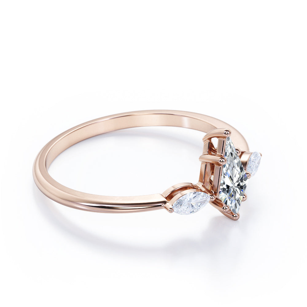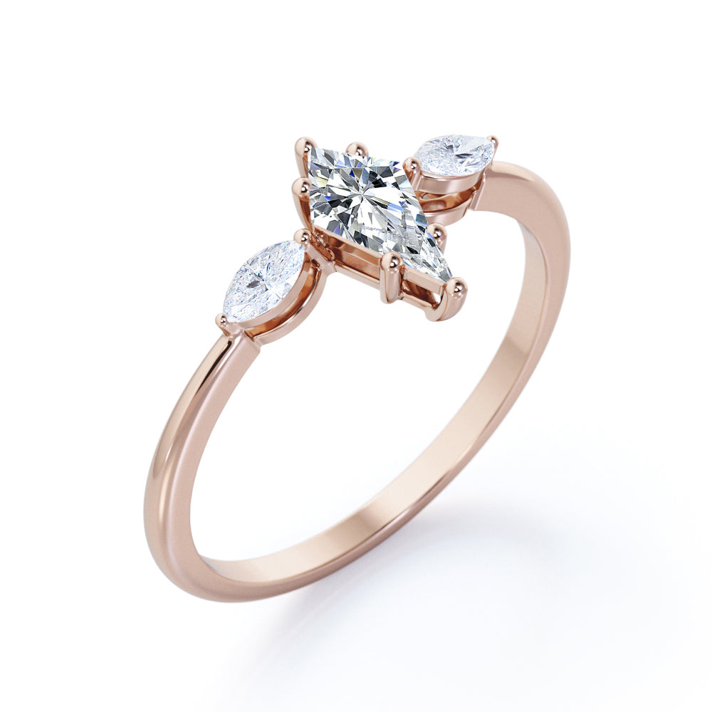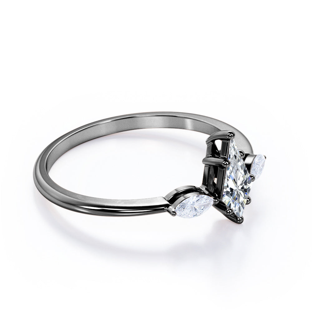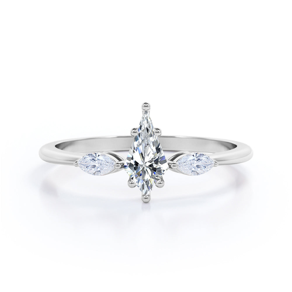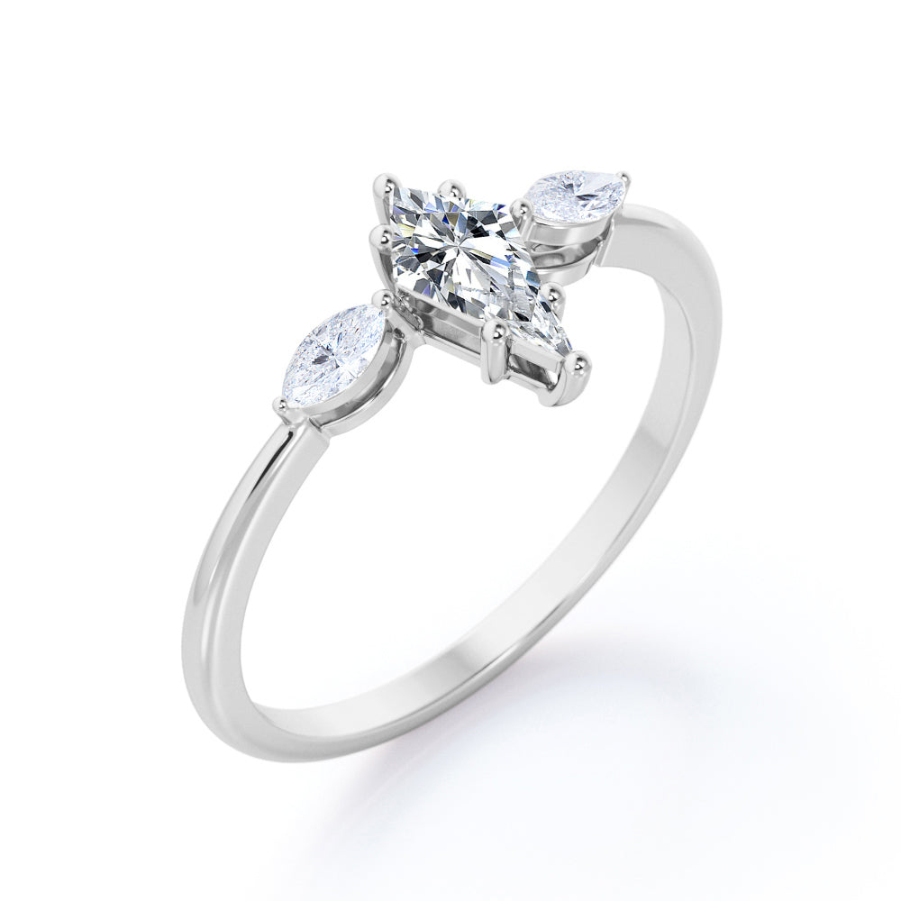 One the Fancy Cut Three Stone Ring 0.55 carat Kite Moissanite and Diamond in White Gold, 3 stones are placed side by side and compliment each other nicely; 0.5 carat kite shape of Moissanite acts as a center stone and next to it are 2 beautiful marquise Moissanite. The ring is versatile and meaningful, it represents your past, present and future life. It's a beautiful way to remind someone about the history of you and them. Our affordable trio promise ring can be customized in to your choice of white gold, rose gold, yellow gold and black gold with the metal options of 18k gold over silver, 10k gold and 14k gold.