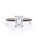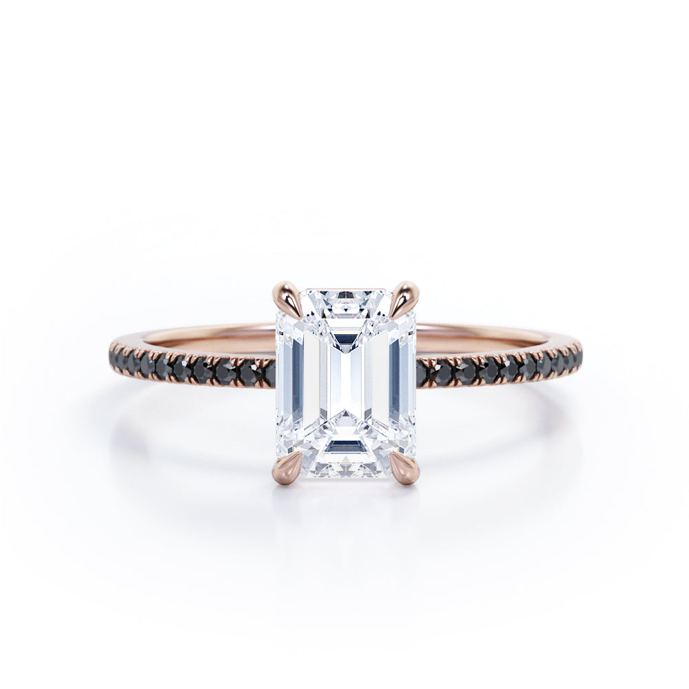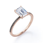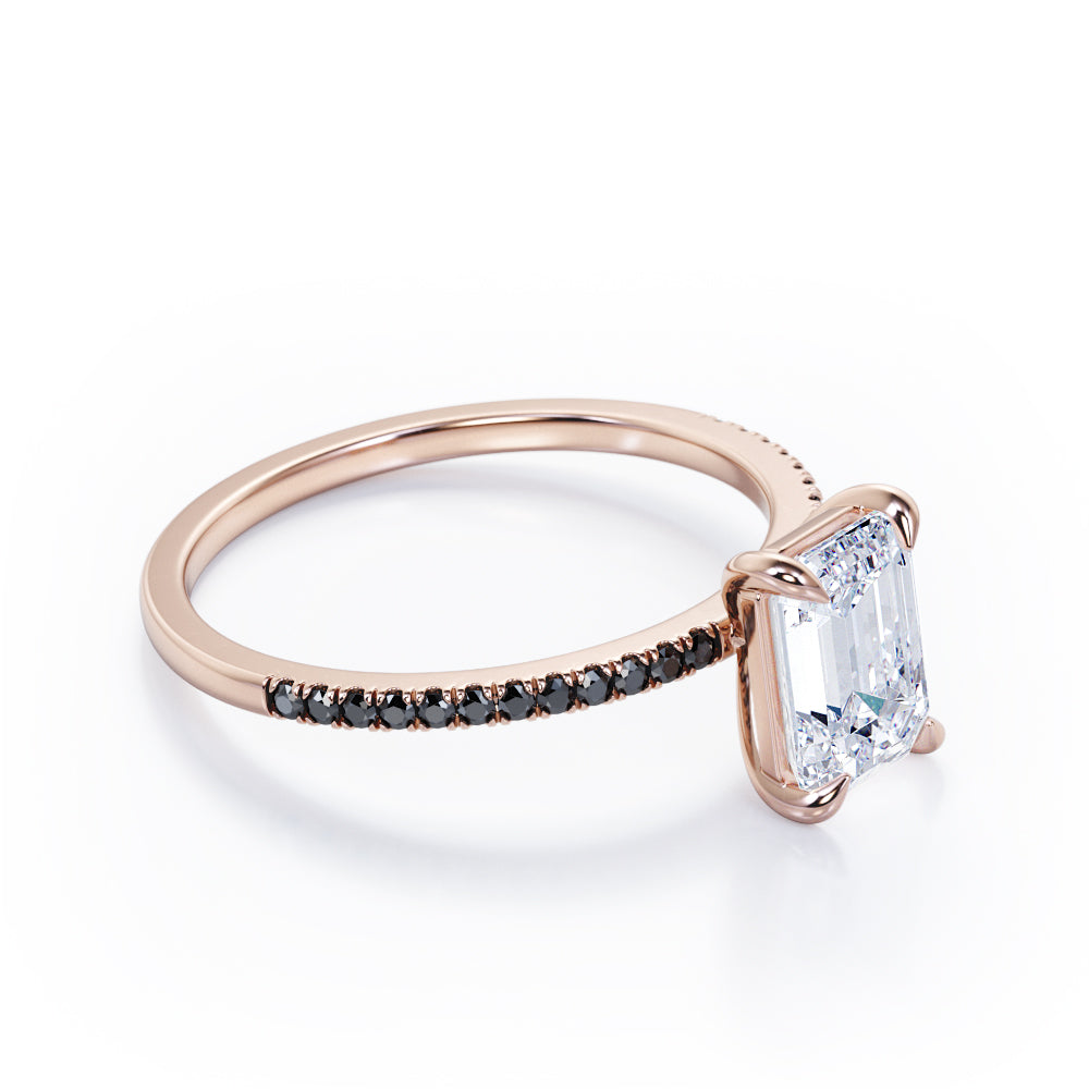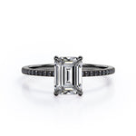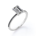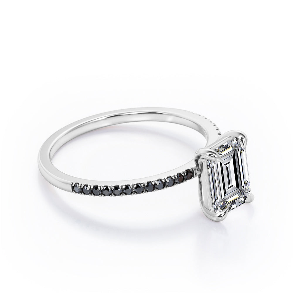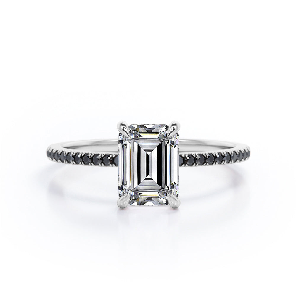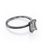 Make someone you love feel amazed by the brilliance of this Four Prong - 1.25 TCW Emerald Cut Moissanite with Lab Created Black Diamond - Engagement Ring with Pave Accents in White Gold. Professionally handcrafted into a fine emerald cut by our skilled jewelers, this astounding moissanite stone ring showcases total 1.25 carat moissanite and lab-created black diamonds. Special and non-traditional, this moissanite ring is perfect for those who would love to express their charisma and uniqueness. With naked eyes moissanites look, shine and feel exactly like diamonds. With its splendor, this moissanite band will unquestionably be an essential additional to any jewelry collection. This moissanite promise ring is beautiful and accessible since it is available at a reasonable price. Moissanites are the most popular alternative gemstone for diamonds while being at lower and more affordable price. If you are looking for a special gift for your friends or your better half, this moissanite jewelry can be a perfect gift for any occasion like engagements, Valentine's day, mother's day or anniversary. Additionally, this white moissanite ring can be customized, so customers can choose one of metal colors between White gold, rose gold, black gold and yellow gold in 18k Gold over Silver, 10k and 14k gold metal options. In regards to its hardness, moissanite is almost as hard as diamond which means that it is notably durable. Letâs impress her with this white moissanite engagement ring and, surely, she will not regret it.