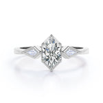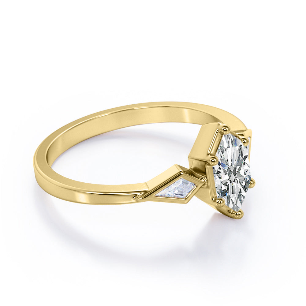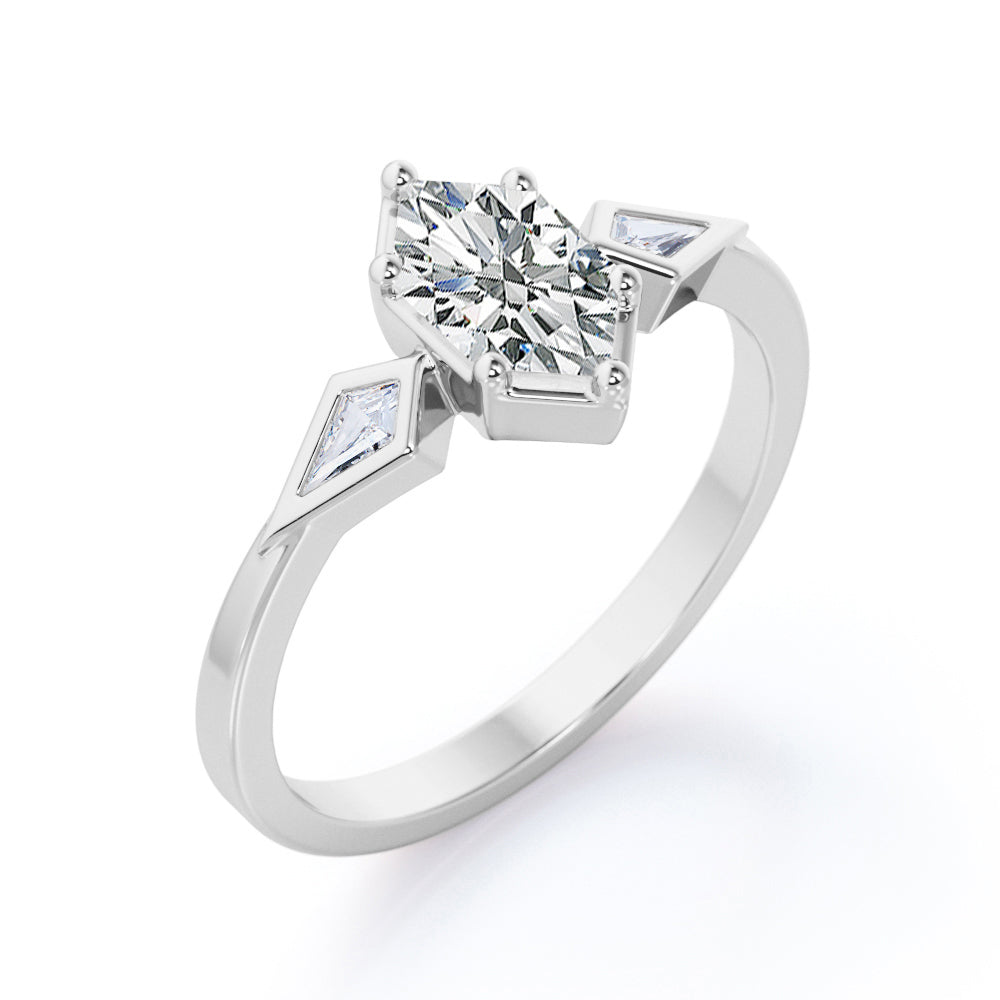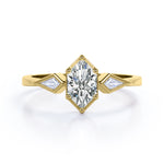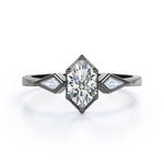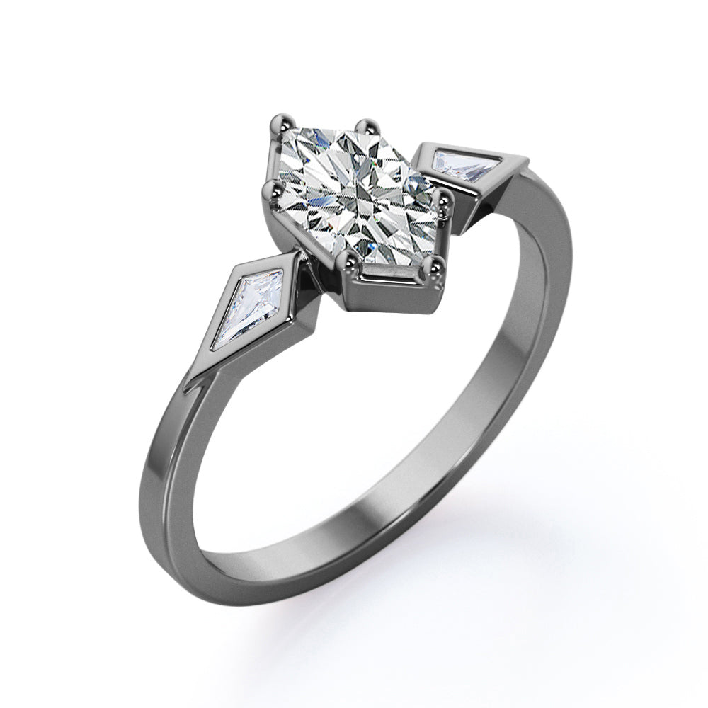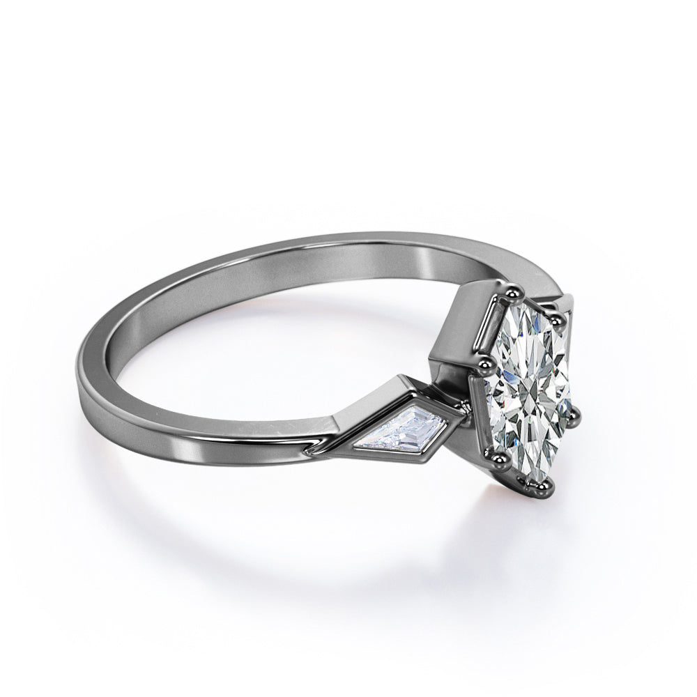 Let this Geometric 1 carat Hexagon Moissanite and Diamond Engagement Ring in Black Gold become her new favorite everyday jewelry. The three stone ring features a 0.75 carat hexagon Moissanite and flanked by kite shape Moissanite in east-west setting. Trio promise ring represents past, present and future, which can be a beautiful reminder of your memorable journey that you shared with your significant other and how you would love to hold on to her until the last day. The ring can be made in 18k gold over silver, 10k gold, 14k gold with the color of white gold, rose gold, yellow gold and black gold.