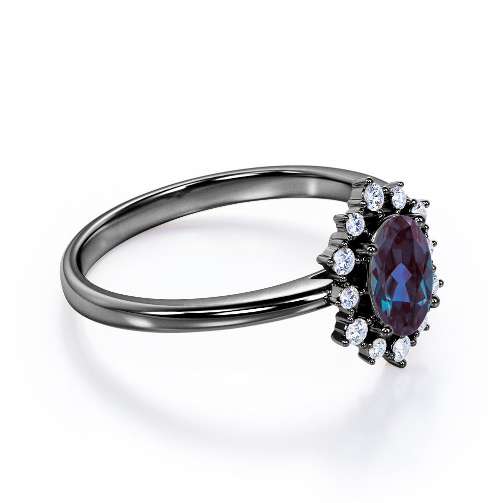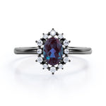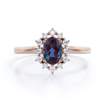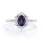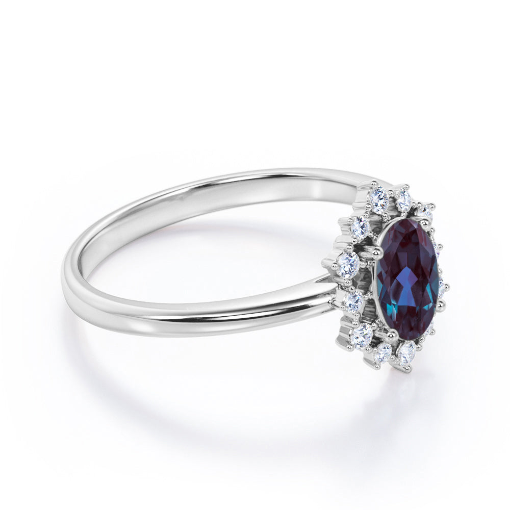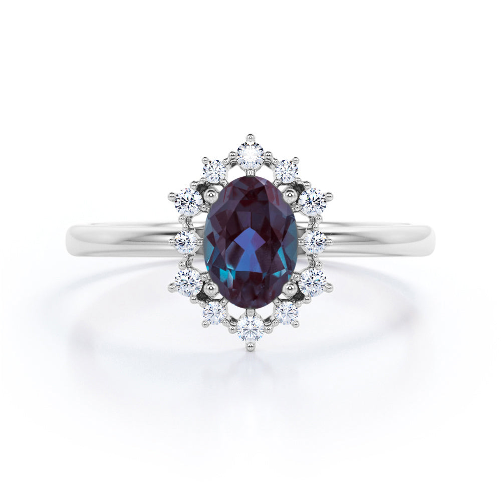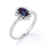 Hexagon Halo 1.20 Carat Oval Cut Lab Created Alexandrite And Diamond Bezel Set Four Prong Engagement Ring In White Gold. We know what you're thinking; We would never stop staring at our hand either. You simply can't go wrong with this alexandrite and diamond engagement ring. A striking oval cut alexandrite stone is surrounded by small round diamonds in a unique star-like halo setting. The band is plain white gold with no any competing stones for a more cool-toned alexandrite hue. The four prong holds the 1 carat alexandrite center stone on its place which exhibits vibrant jewel tones. This hexagon halo 1.20 carat oval cut lab created alexandrite and diamond bezel set four prong engagement ring in white gold can also be customized to 18k Gold plating over silver, 10k Gold or 14k Gold as you prefer. So, wait no more and be that unique person who will create a new trend by choosing something distinctive like this mystic alexandrite engagement ring.