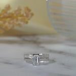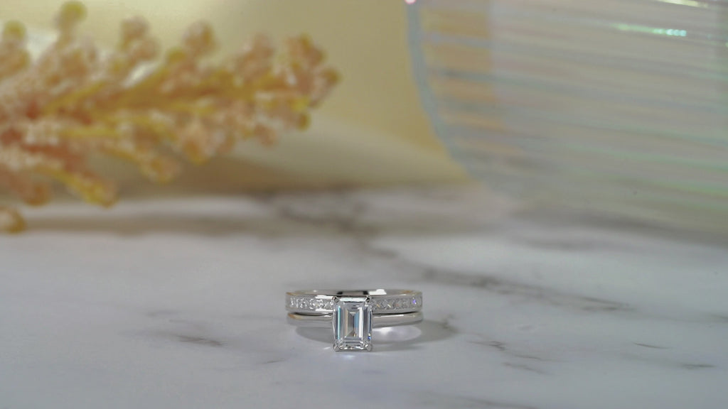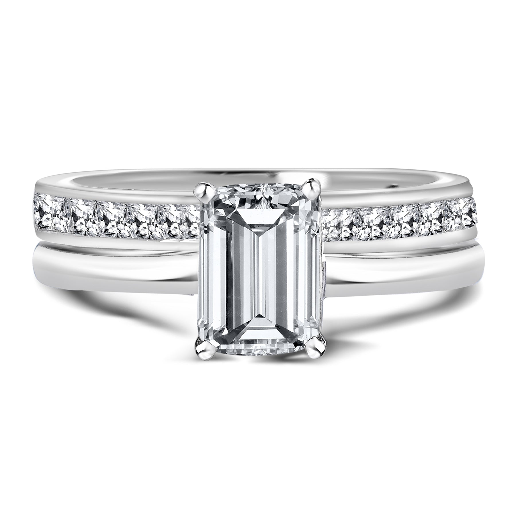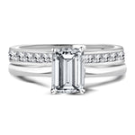 This Majestic 1.5 Carat Emerald cut Moissanite Shaped Bridal Set - Channel Set Wedding Band - in 18K White Gold over Silver is the most unique and the best gift you can give to your cherished ones. Each of these emerald cut Moissanite wedding sets showcases a classy 1 carat Moissanite emerald cut engagement ring and a stylish 0.5 carat princess cut channel band. Look no further if you are looking for a perfect and affordable engagement rings for your loved ones, especially when this set doesn't come with only one, but two high-quality Moissanite rings. The set features a classic, yet elegant solitaire emerald engagement ring and a modish channel set eternity band that matches perfectly with the classy engagement ring. Being able to be worn together as a wedding set or as two separate rings, the set is the most affordable and available at the greatest value. Both of the rings of these emerald wedding ring sets feature both a classic engagement ring and a playful wedding band hence, will never go out of trend and are sure to match with any piece of jewelry that you own. Tell them you love them with this Majestic 1.5 Carat Emerald Shaped Bridal Set - Channel Set Wedding Band - in 18K White Gold over Silver.