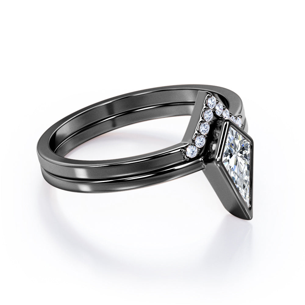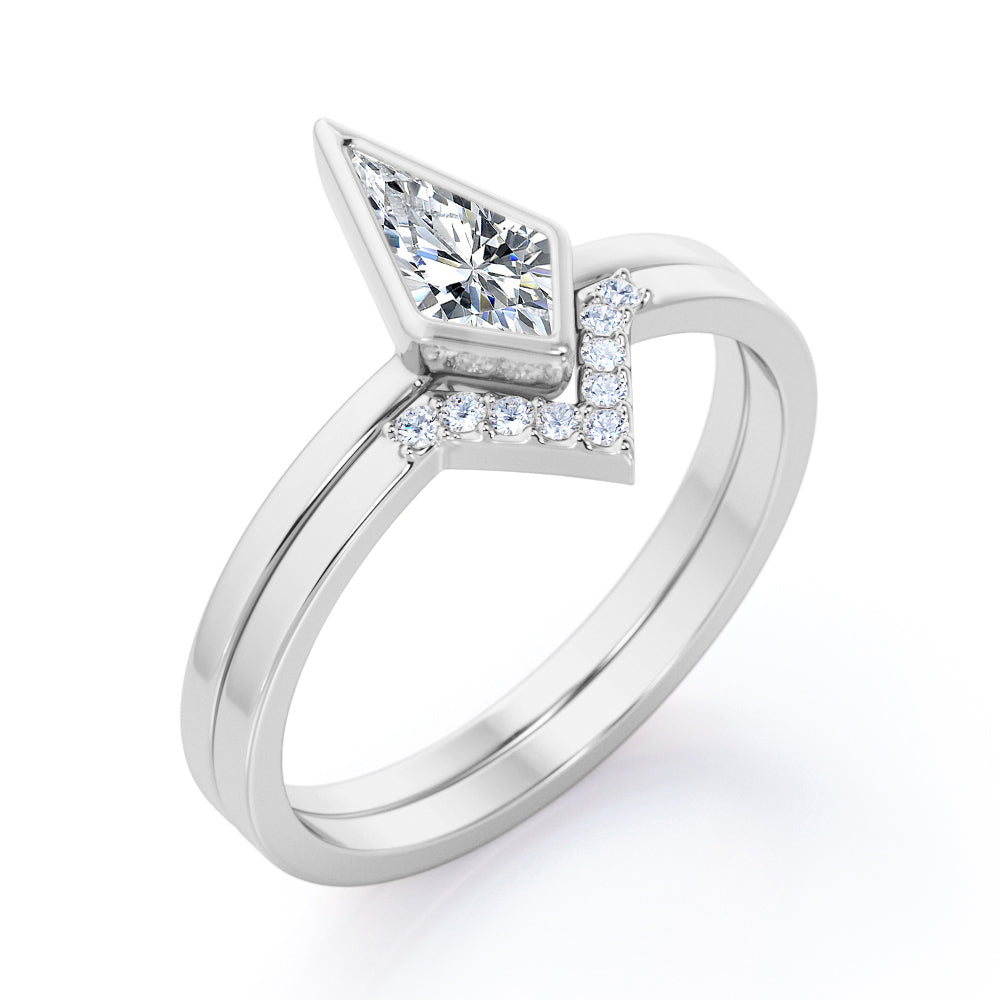 Matching Bezel 1.1 carat Kite Moissanite and Diamond Wedding Set in White Gold would be a pleasant choice to surprise your lover if they are in love with minimal jewelry. The engagement ring showcases a 1 carat kite Moissanite in bezel setting and it is complimented by V-shaped wedding band that is garnished with petite round diamond. The lustrous Moissanite bridal set can be made in 18k gold over silver, 10k gold, 14k gold with the color of white gold, rose gold, yellow gold and black gold.