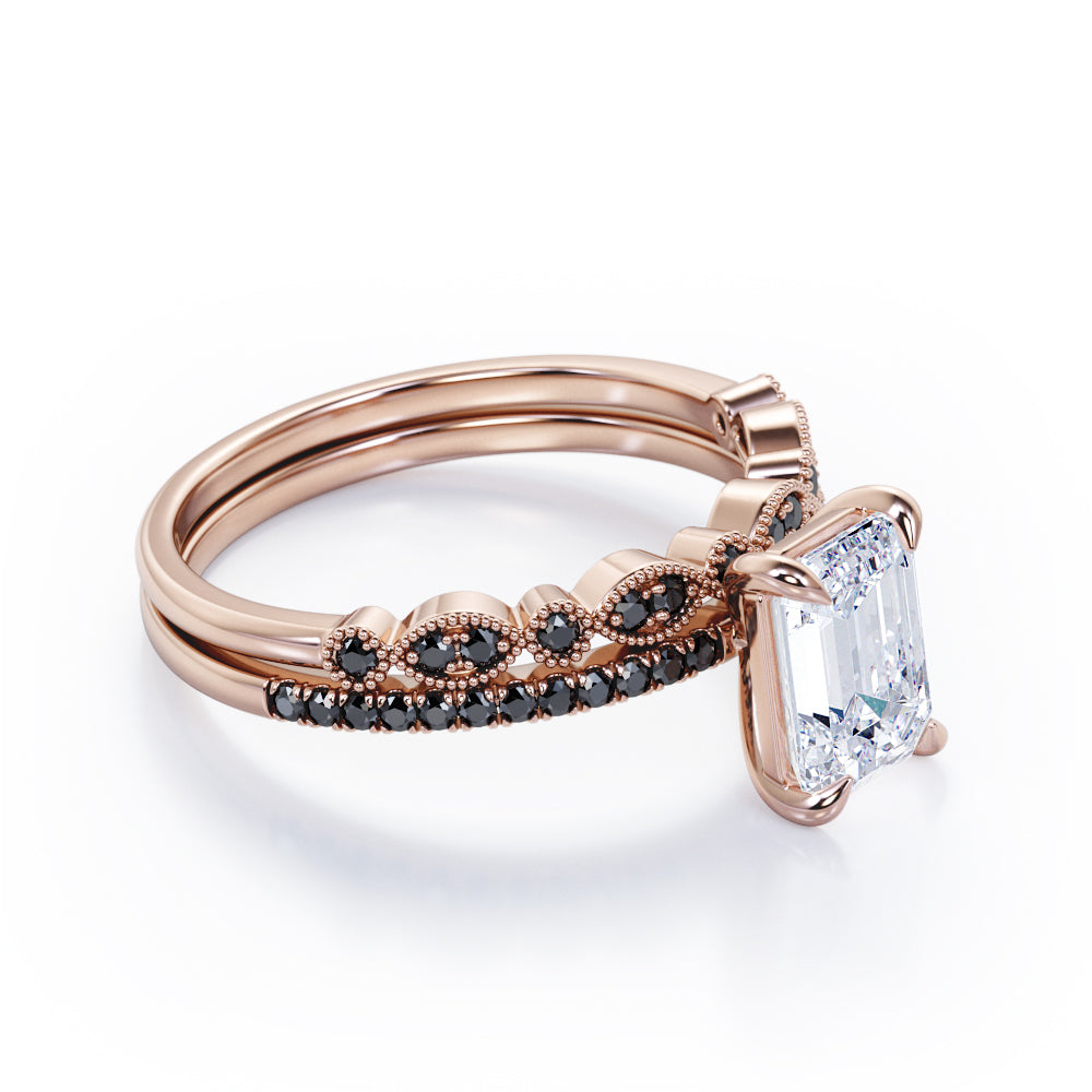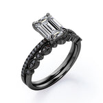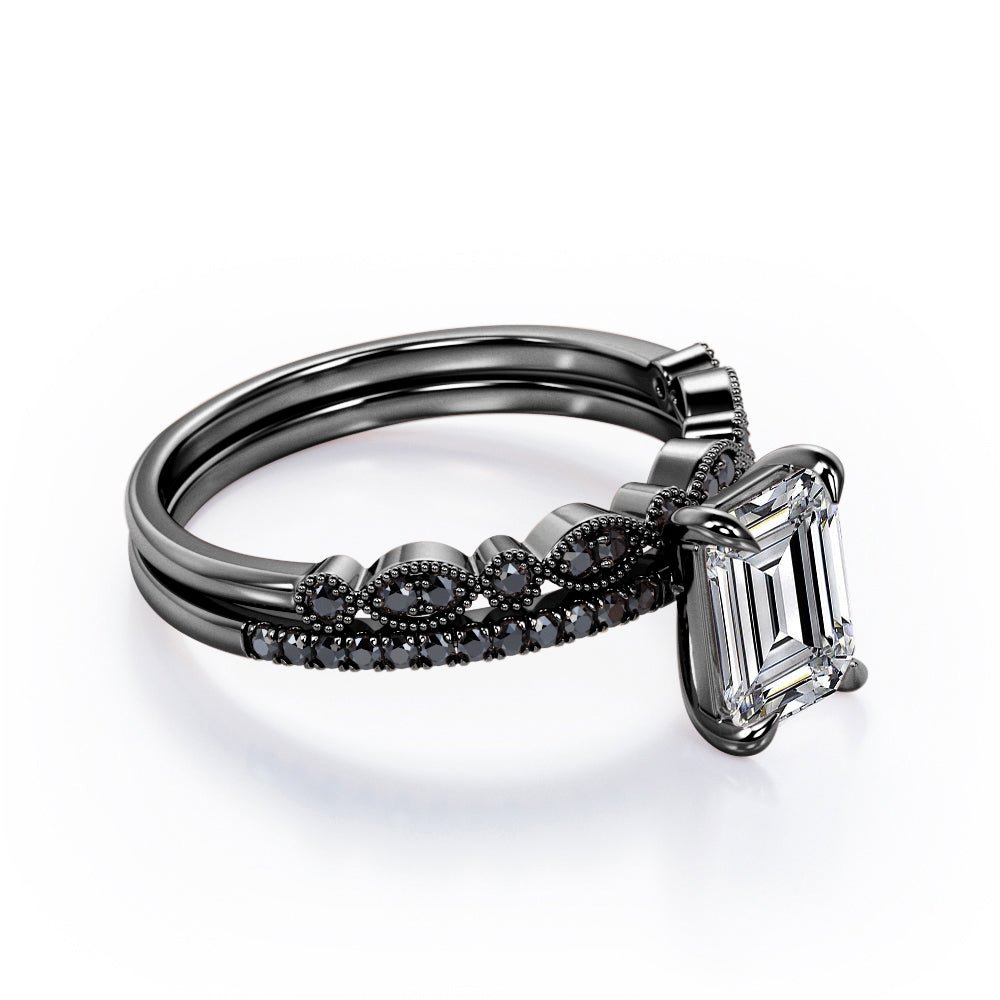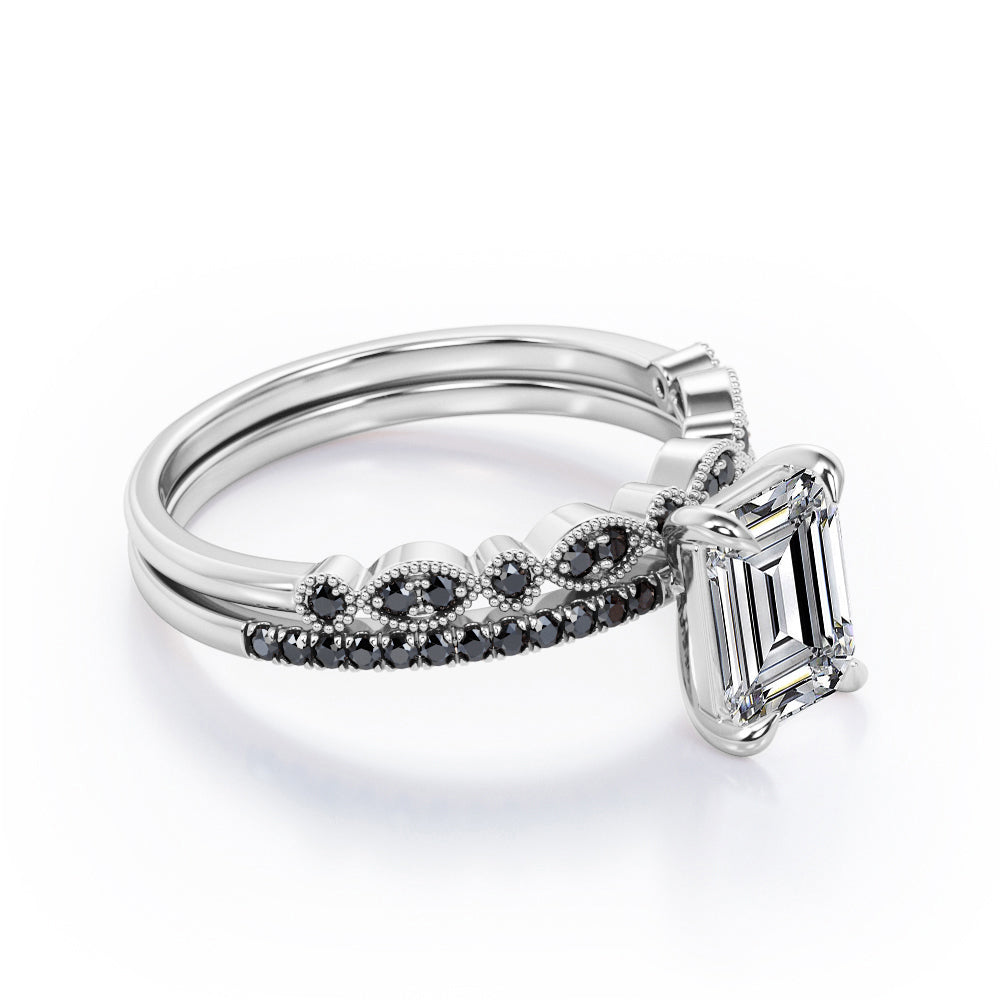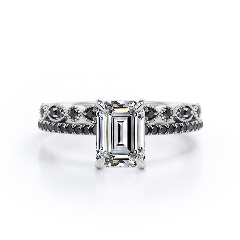 Milgrain Filigree - 1.55 TCW Emerald Cut Moissanite with Lab Created Black Diamond - Pave Accented Bridal Ring Set in White Gold