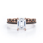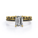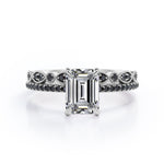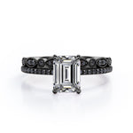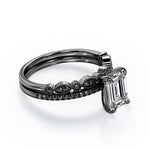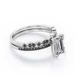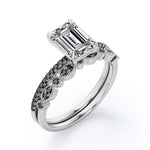 Be highly fashionable with this Milgrain Filigree - 1.55 TCW Emerald Cut Moissanite with Lab Created Black Diamond - Pave Accented Bridal Ring Set in White gold. Skillfully hand-cut into a nice emerald cut by our experts in lapidary, this appealing best moissanite rings set is made up of total 1.55 carat moissanite and lab-created black diamonds. Distinctive and extraordinary, this moissanite wedding set is perfect for those who would love to express their charisma and uniqueness. With naked eyes moissanites look, shine and feel exactly like diamonds. Reflective properties of this silver moissanite ring set will absolutely enhance every style of its wearer. This moissanite promise ring set is beautiful and accessible since it is available at a reasonable price. Moissanites are the most popular alternative gemstone for diamonds while being at lower and more affordable price. If you are looking for a special gift for your friends or your better half, this moissanite bridal ring set, the birthstone ring for April, symbolically representing strength and an unbreakable love, will be the greatest choice you will ever make. Also, this moissanite bridal ring set can be customized, either in White gold, rose gold, yellow gold or black gold in 18k Gold over Silver, 10k and 14k gold metal options upon customer request. In regards to its hardness, moissanite is almost as hard as diamond which means that it is notably durable. Let's fulfill your love story with this sterling silver moissanite wedding rings set, and she will be eternally joyful.