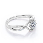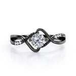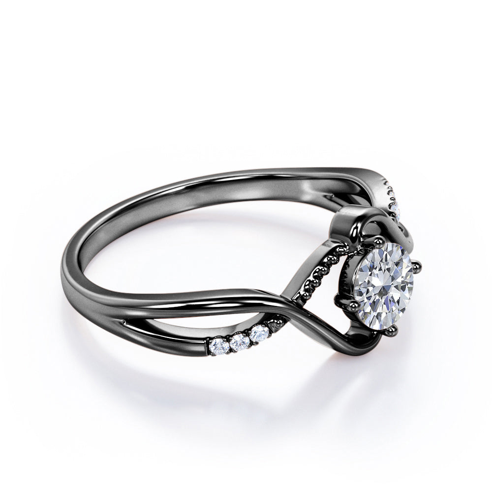 Be fashionable with the Modern Twisted 0.55 carat Round Moissanite and Diamond Infinity Engagement Ring in Rose Gold. The promise ring showcases a 0.5 carat round cut of Moissanite that is connected to a split shank band and illustrates a double crossed heart in the middle. The band is twisted into No. 8, or the infinity symbol. It is a sign to show the love of your life that you want to spend the rest of your life with them. On the band, featured a Milgrain decoration with paved Moissanite to add some playfulness to the ring. It can be made in 18k gold over silver, 10k gold, 14k gold with the color of white gold, rose gold, yellow gold, black gold.