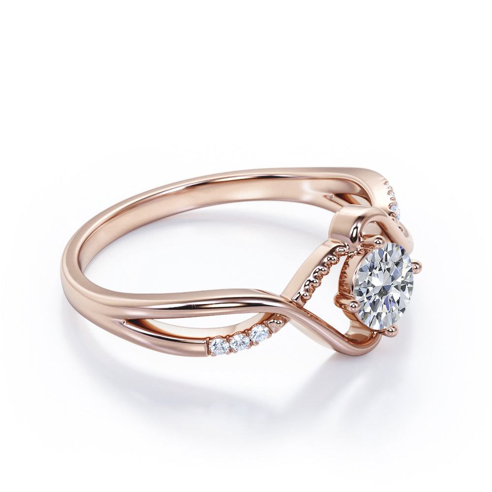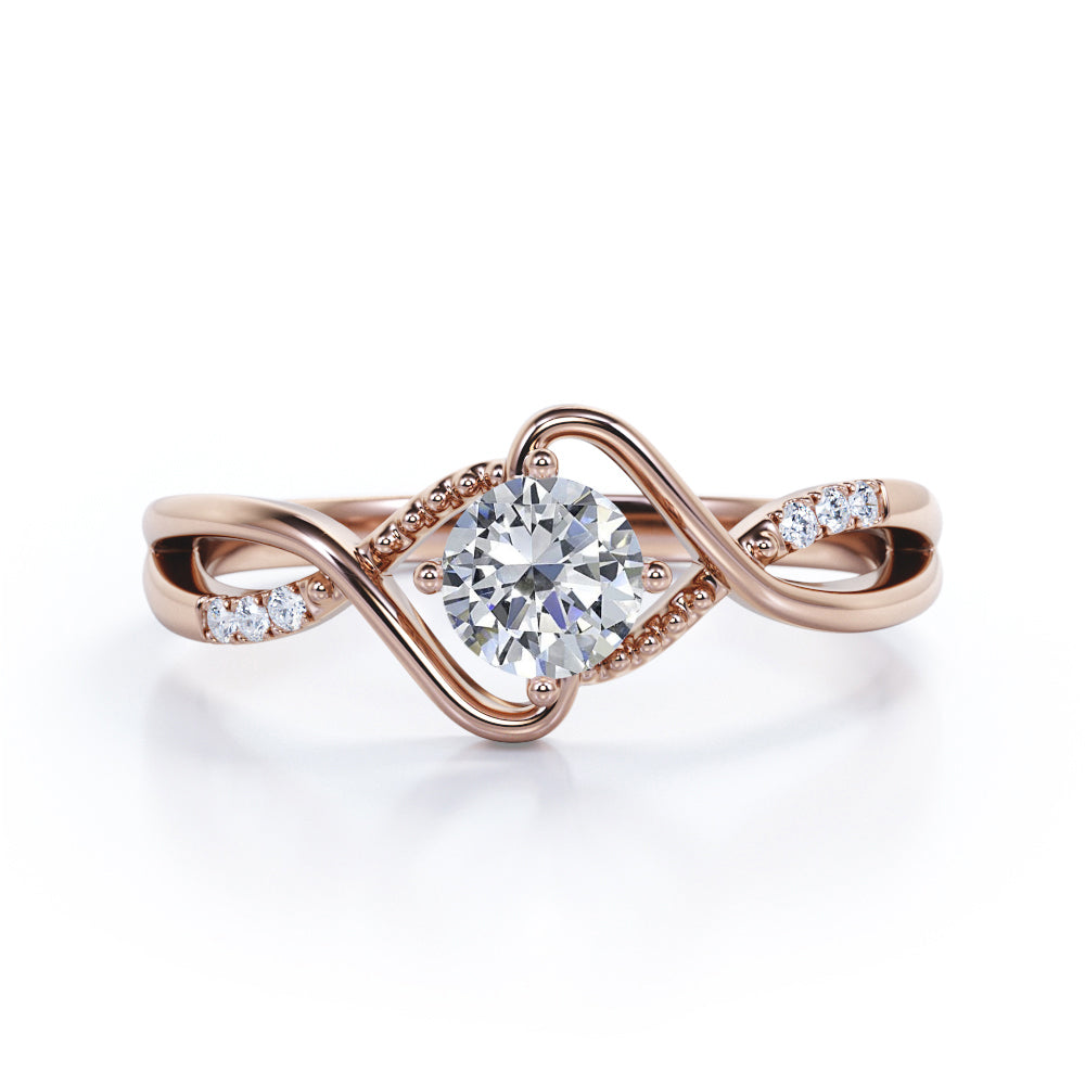 Modern Twisted 0.55 carat Round Moissanite and Diamond Infinity Engagement Ring in Rose Gold