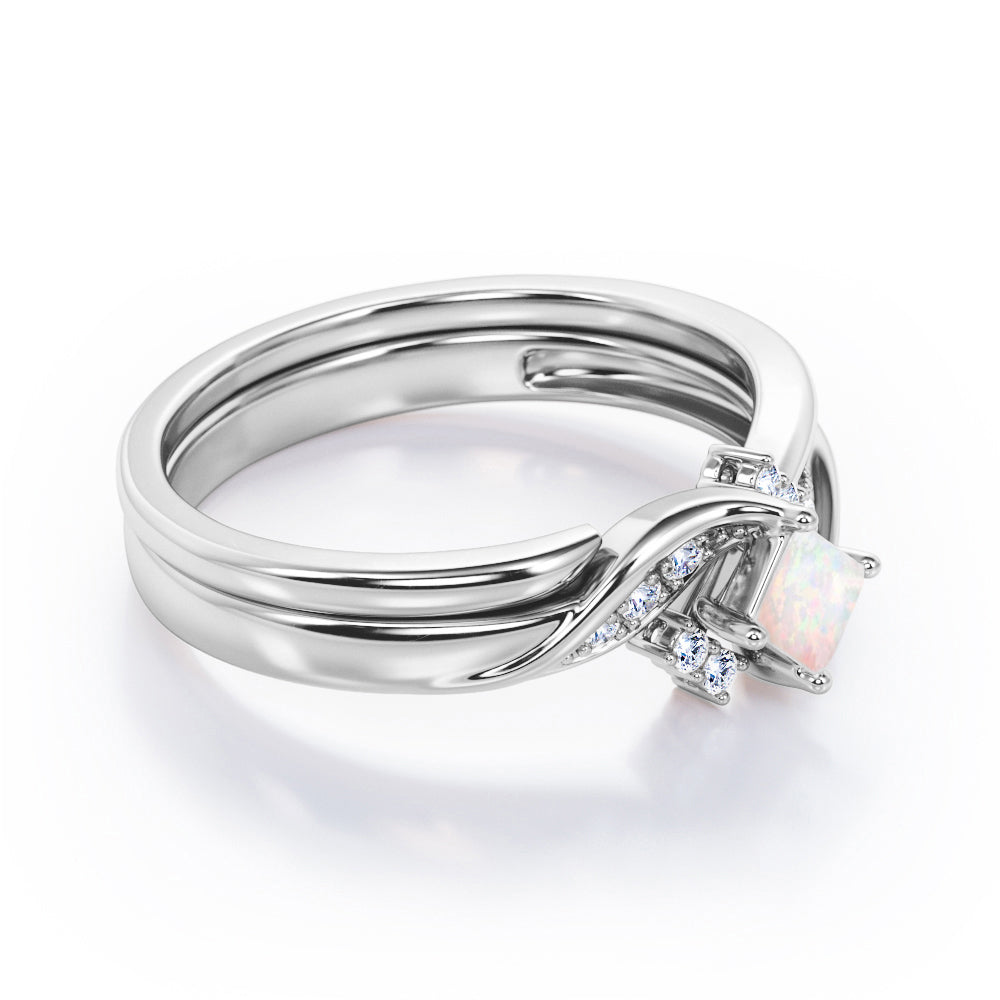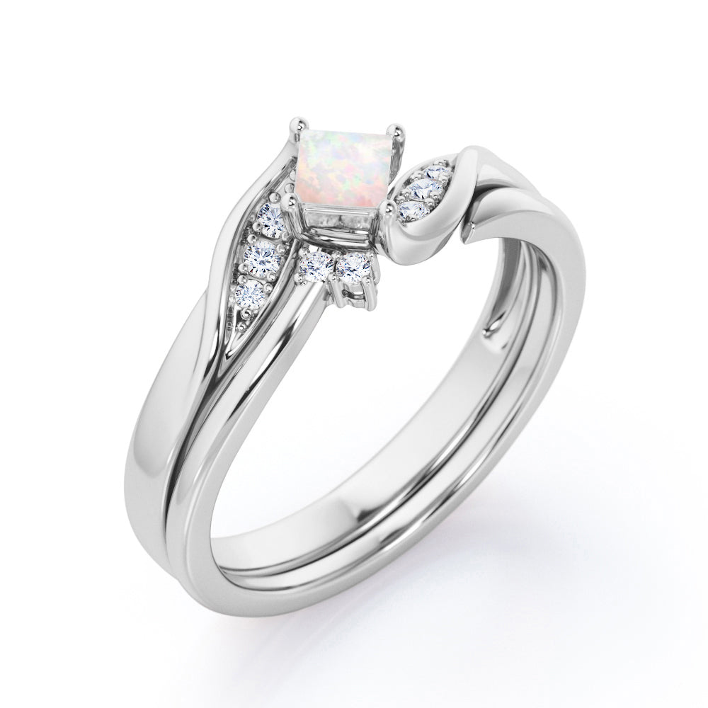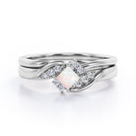 Petite Pave-Channel - 0.55 TCW Rhombus Princess Cut Opal and Moissanite - Prong Tensioned Wedding Ring Set - Rose Gold