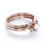 Embrace a new style bridal ring set with this Petite Pave-Channel - 0.55 TCW Rhombus Princess Cut Diamond - Prong Tensioned Wedding Ring Set - Rose Gold. This classic ring set contains two rings; one promise ring and a wedding band. A 0.5 carat princess Opal is placed on the engagement ring with three round Moissanite on each side of it for a silver ring and diamonds for a gold ring. The band is twisted and curved like it is about to merge together. Comes matching with the seven stone ring is an open shank wedding band; the ring possesses four round Moissanite; they are breakdown to dual stones and placed separately.