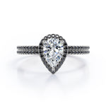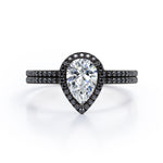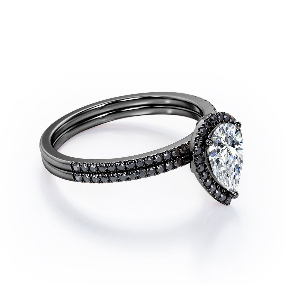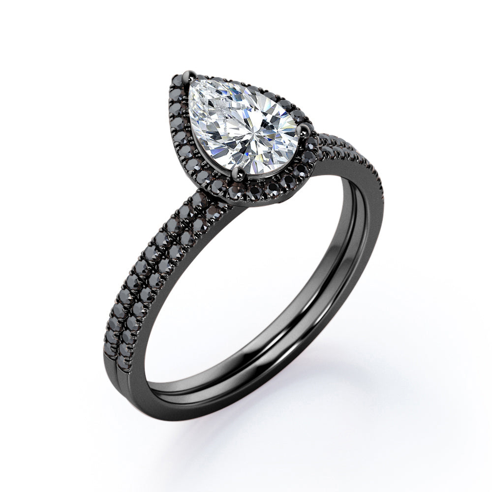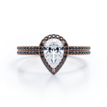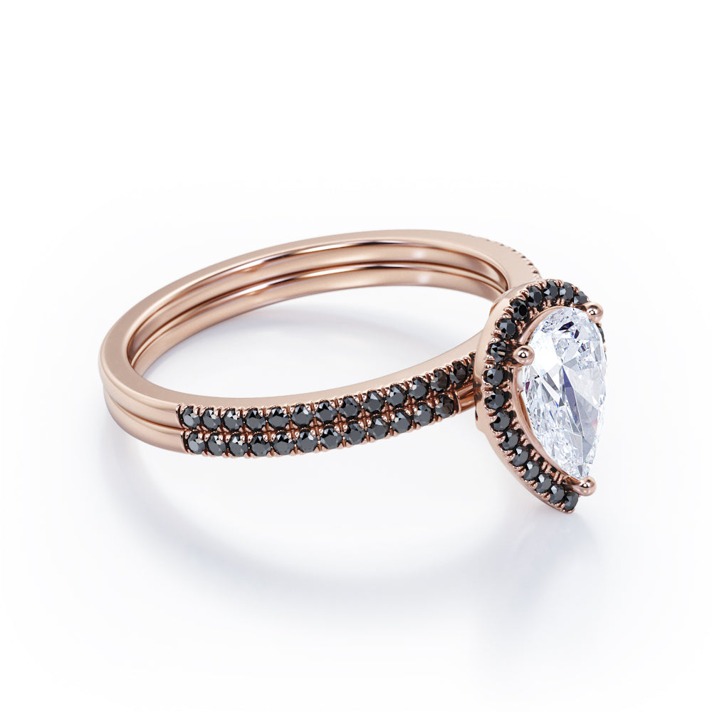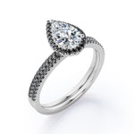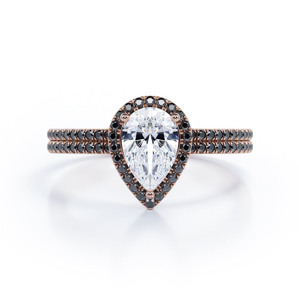 Start the greatest love story of your life with this Scalloped Pave - 1.75 TCW Pear Shaped Moissanite with Lab Created Black Diamond - Halo Design Bridal Set in Rose gold. Professionally handcrafted into a fine pear cut by our skilled jewelers, this elegant best moissanite engagement rings set combines total 1.75 carat moissanite and lab-created black diamonds. Distinctive and extraordinary, this sterling silver moissanite engagement rings set is well-suited for those who are not quite into normal lifestyle. With naked eyes moissanites look, shine and feel exactly like diamonds. With its glory and clarity, this silver moissanite ring set will unquestionably be an essential additional to any jewelry collection. This moissanite anniversary band set is beautiful and accessible since it is available at an affordable price. Moissanites are the most popular alternative gemstone for diamonds while being at lower and more affordable price. If you are looking for a special gift for your friends or your better half, this moissanite silver engagement rings set, the birthstone ring for April, symbolically representing strength and an unbreakable love, will be the greatest choice you will ever make. This moissanite ring set can be customized to your own choice of metal colors: White gold, rose gold, yellow gold and black gold in 18k Gold over Silver, 10k and 14k gold metal options. In regards to its hardness, moissanite is almost as hard as diamond which means that it is notably durable. Letâs impress her with this moissanite band set, and she will be eternally joyful.