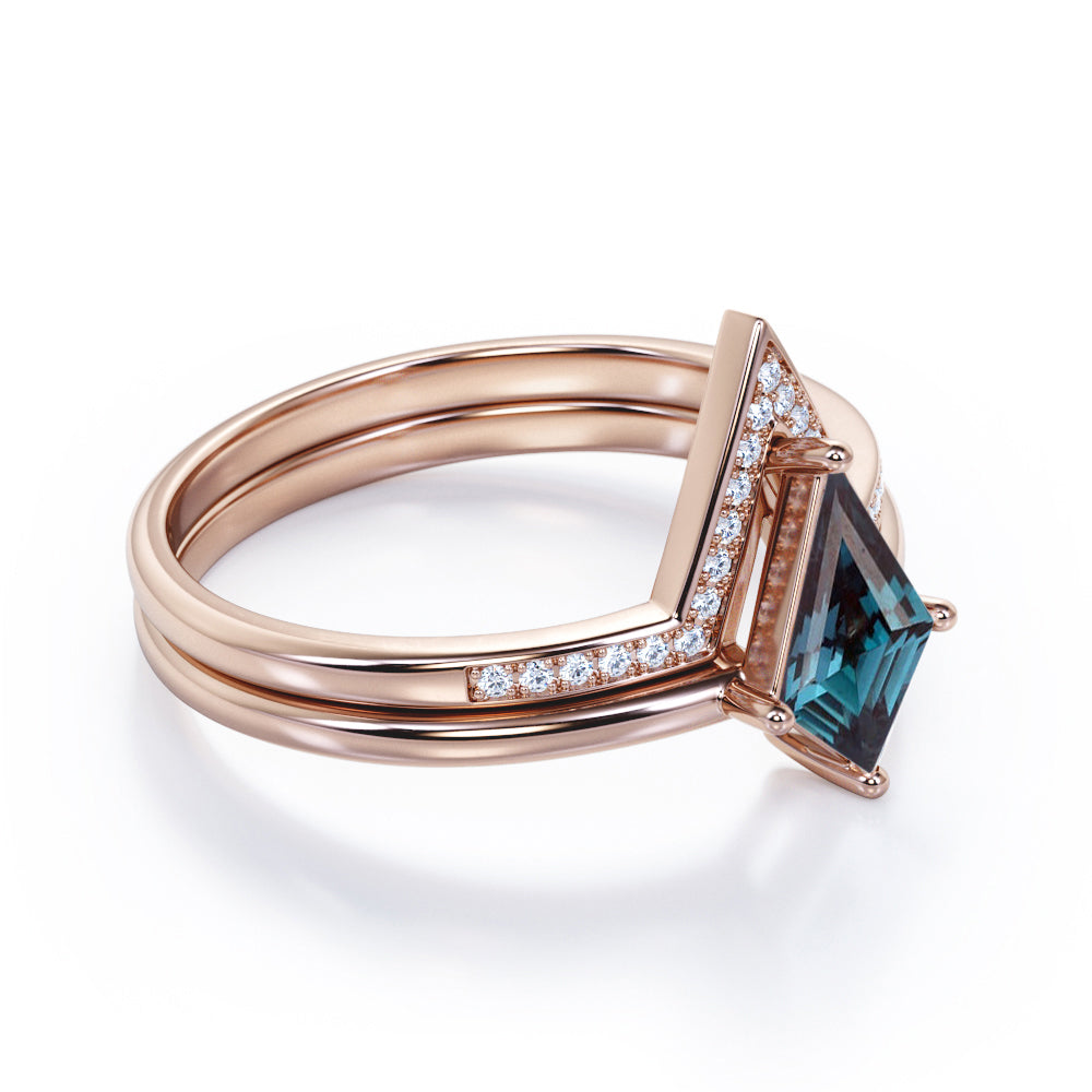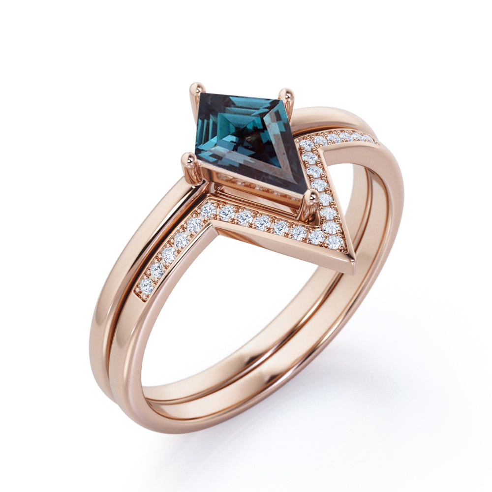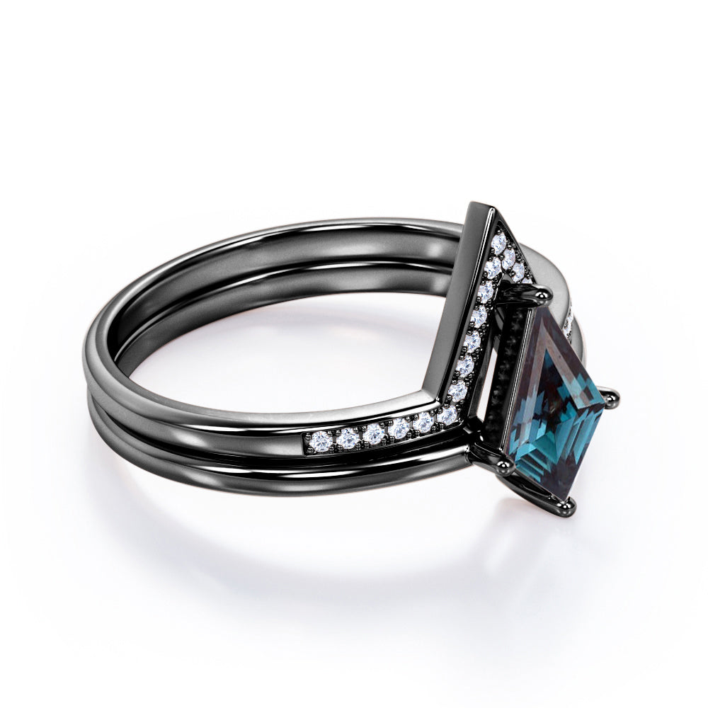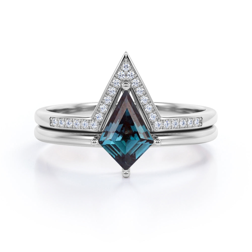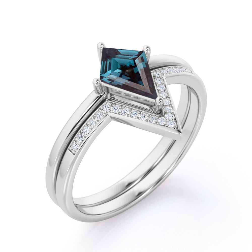 Solitaire 1.15 Carat Kite Shaped Lab Created Alexandrite V Shaped Channel Set Wedding Ring Set In White Gold. "A slightly mysterious and foreboding ring." Presenting our newly added fresh designs in alexandrite rings collection which you are surely going to love. Delicate and simple while still being very classy, this is a good mix of classic and non-traditional. This wedding ring set features four prongs which holds the center alexandrite stone of 0.85 carat inclusive of 0.3 carat dazzling diamonds on the matchong V shaped wedding band. The diamonds are channel set on the white gold band which radiates great brilliance and unbelievable sparkle. Since, all of our products are handmade with love by our old artisans, this solitaire 1.15 carat kite shaped lab created alexandrite V shaped channel set wedding ring set in white gold can also be customised in 18k Gold plating over silver, 10k Gold or 14k Gold depending upon your choice. So hurry up and simple click on ress add to your cart button below now and make this statement piece all yours forever.