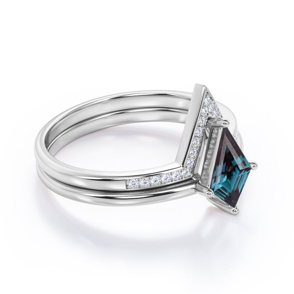 Solitaire 1.15 Carat Kite Shaped Lab Created Alexandrite V Shaped Channel Set Wedding Ring Set In White Gold.