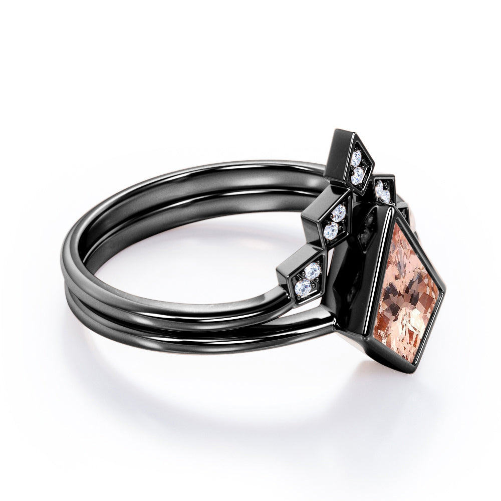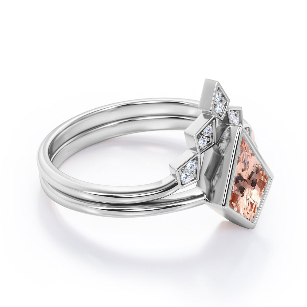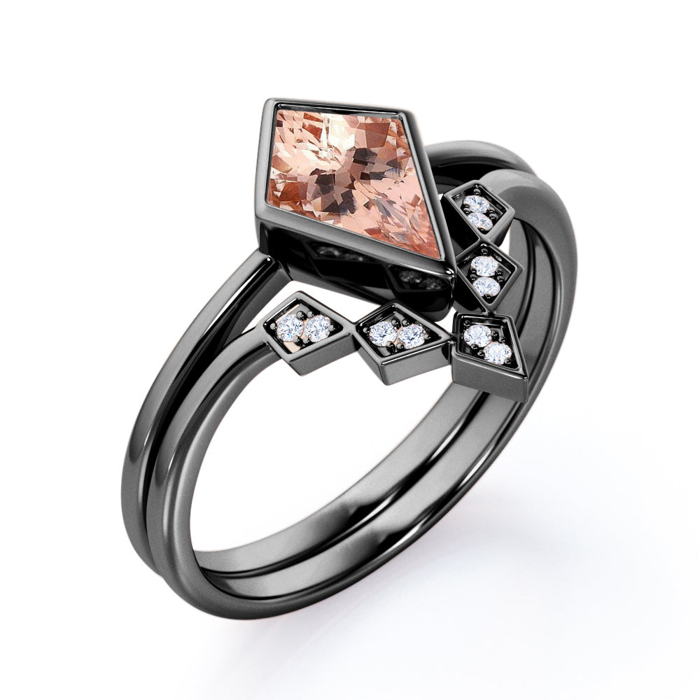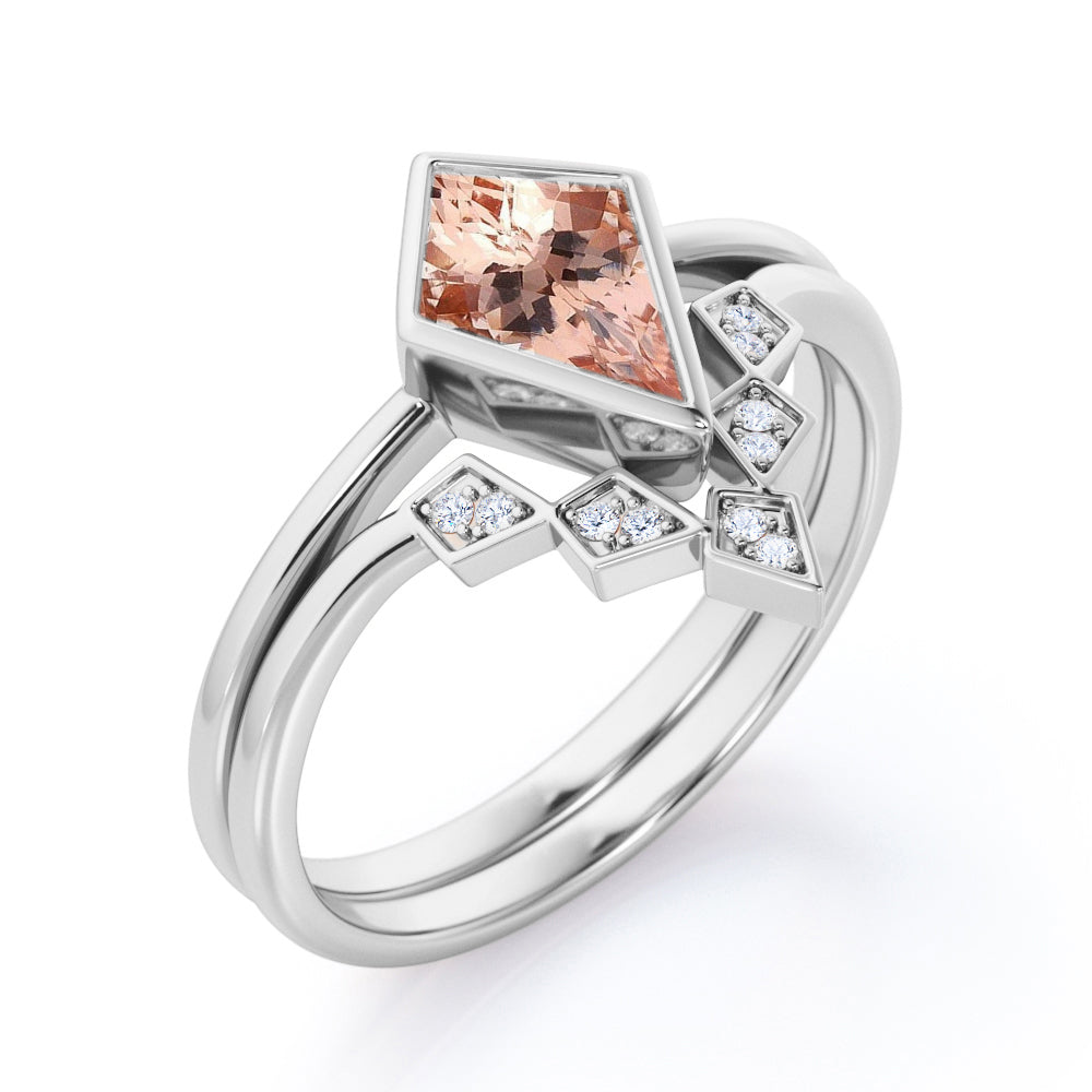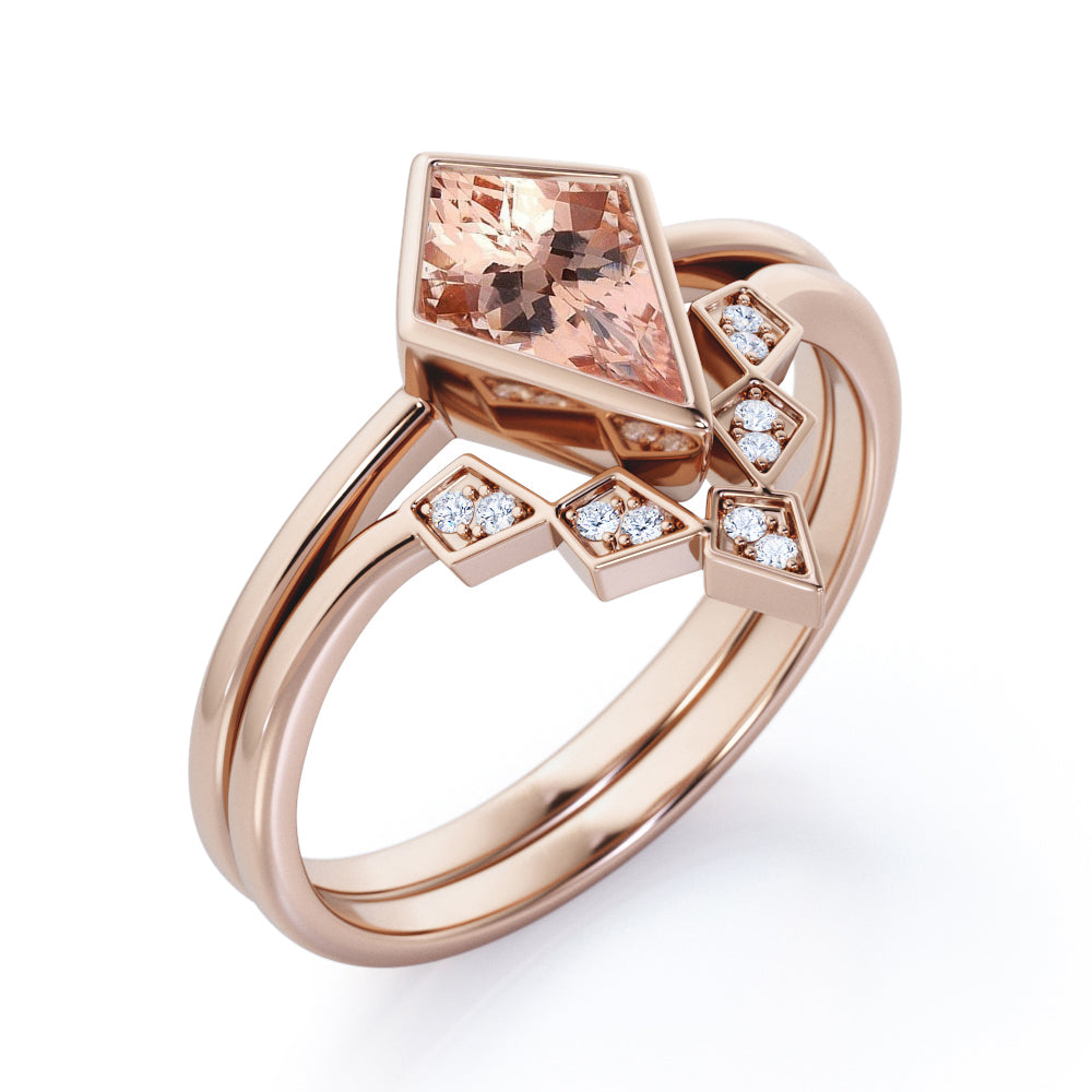 Mark the date and propose to your future wife with this Solitaire Bezel set 1.1 carat Kite Morganite and Moissanite Minimal Wedding Ring Set in Rose Gold. The bridal ring set which is composed by one engagement ring and one wedding band promotes a minimal style. If your partner has simplicity of life style, this can be one of the choices. The engagement ring or promise ring displays a striking 1 carat kite Morganite in bezel set on a well polished plain band. A steep chevron wedding band that comes in the set is made with 5 kite shapes that feature double round Moissanite inside. Both rings can be made in 18k gold over silver, 10k gold and 14k gold with the color of white gold, rose gold, and black gold.