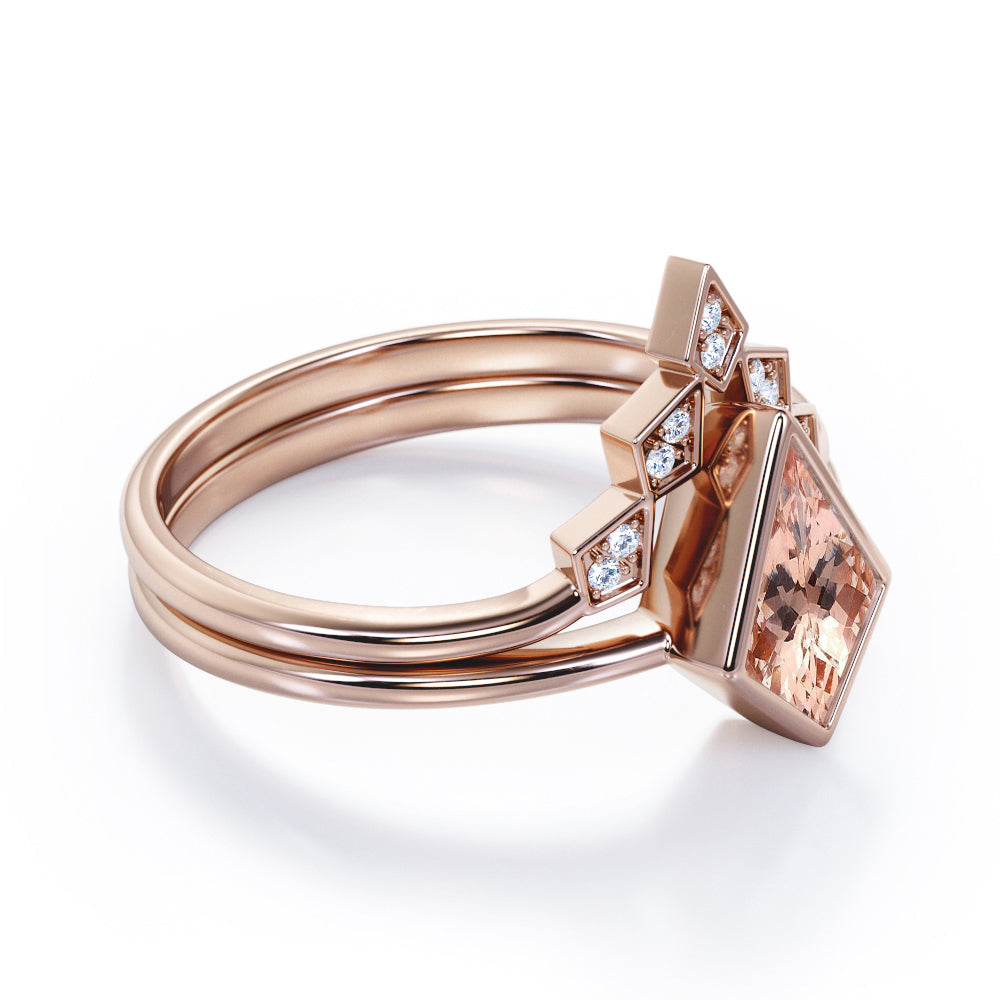 Solitaire Bezel set 1.1 carat Kite Morganite and Moissanite Minimal Wedding Ring Set in Rose Gold