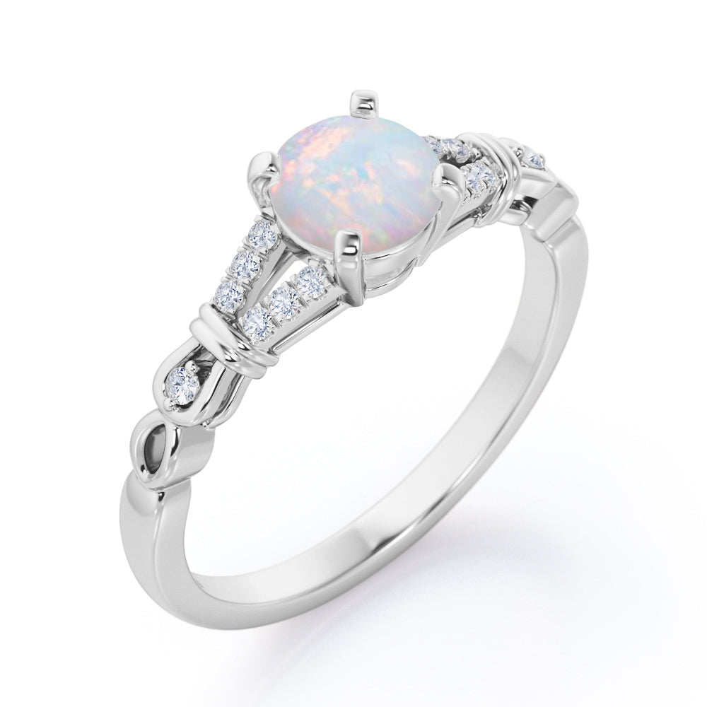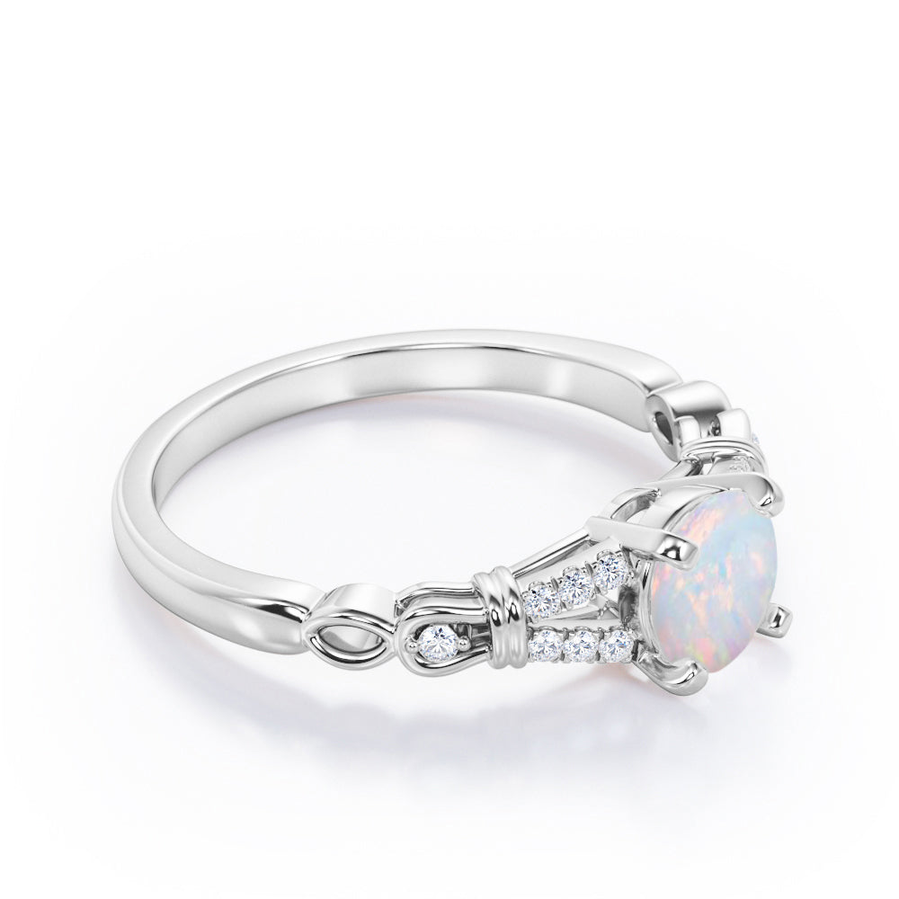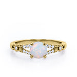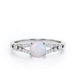 Either it's a special occasion or just an ordinary, ring is always something you can get for all women. The Split Shank 0.6 carat Round Opal and Diamond Engagement Ring in Rose Gold features a 0.5 carat Round diamonds on Y-shaped band, illustrating a tied rope with double knot. The band is garnished by dainty round diamonds with 7 stones on each side. The ring can be customized to your choice of 18k gold over silver, 10k gold and 14k gold with the color of white gold, rose gold, yellow gold and black gold.