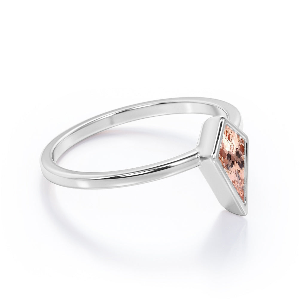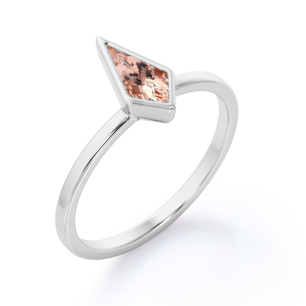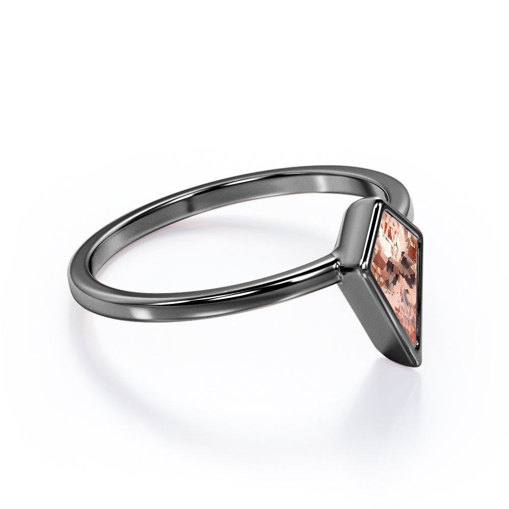 Portray your love through this Stunning 1 carat Kite Morganite and Moissanite in Bezel Setting Engagement Ring in Black Gold. What is a better way to propose to your lover than to surprise her with a solitaire Morganite ring. Morganite is believed to be a stone of divine love and sole stone is sometimes believed to be a one true love that you give to your partner. This promise ring features a 1 carat kit Morganite in bezel setting which give the ring a neat clean look. It looks definitely elegant and also minimal. To those who doesn't like fancy jewelry, this is your ring. The ring comes with 3 metal options; 18k gold over silver, 10k gold and 14k gold with the 3 colors; white gold, rose gold and black gold. You can choose whichever one that will fit you beloved one most.