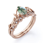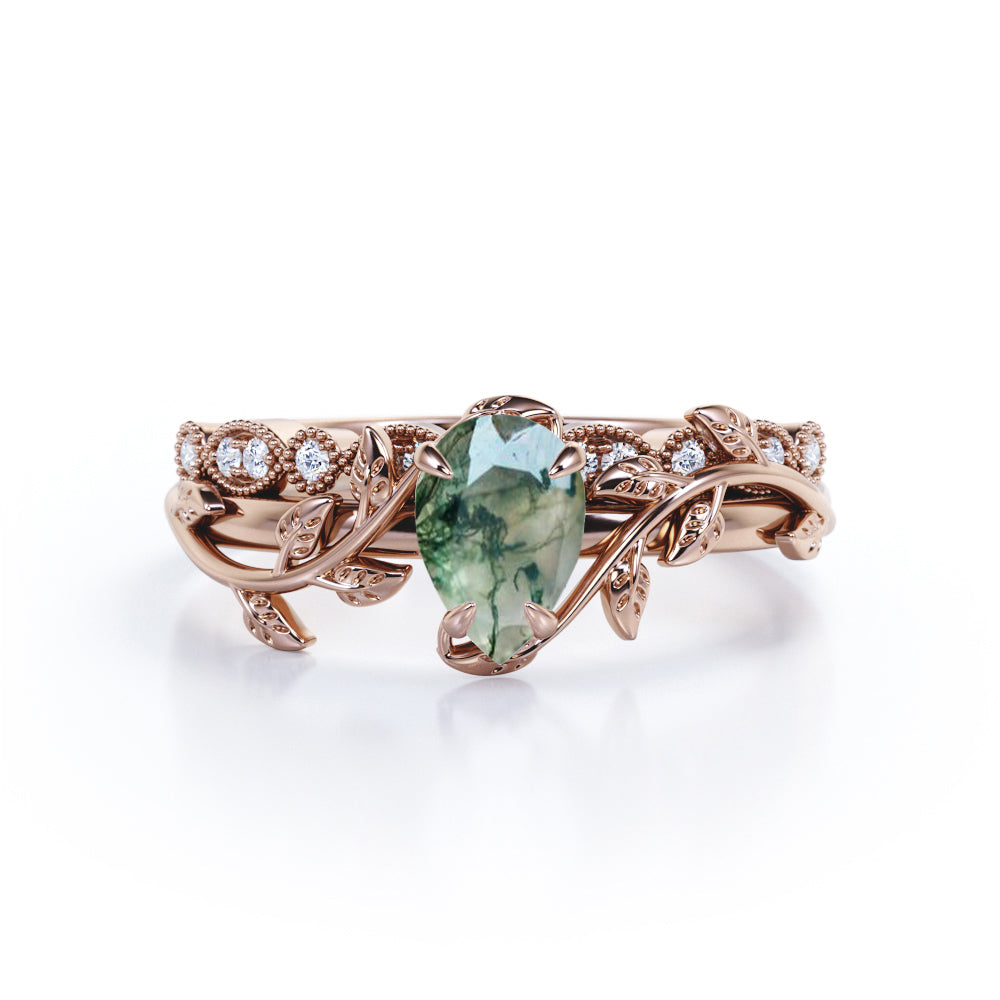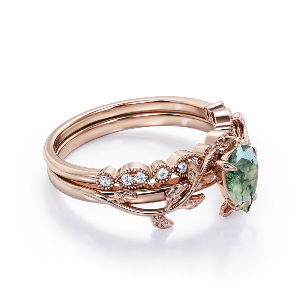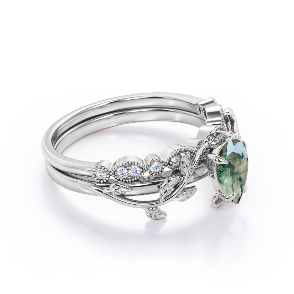 Floral 1.25 Carat Pear Moss Agate Bridal Set