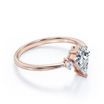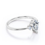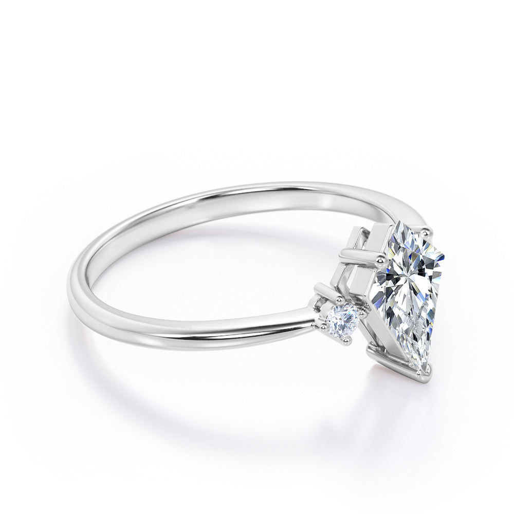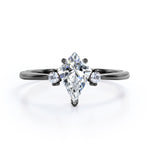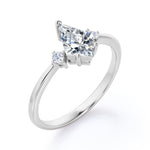 The popular engagement ring; three stone ring, is also known as the past present and future ring. The meaning and simplicity of the ring makes it become one of the famous choices. Trio Stone 0.55 carat Kite Moissanite and Diamond Sleek Engagement Ring in Black Gold possesses a 0.5 carat kite Moissanite with 2 round Moissanite. Three stones are placed in the middle of the pinched shank band. The promise ring can be made in 18k gold over silver, 10k gold and 14k gold with the color of white gold, rose gold, yellow gold and black gold.