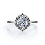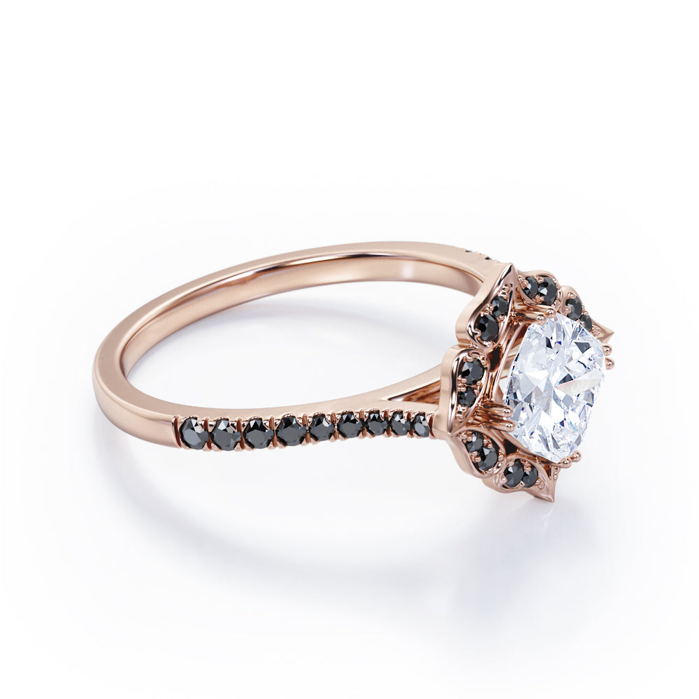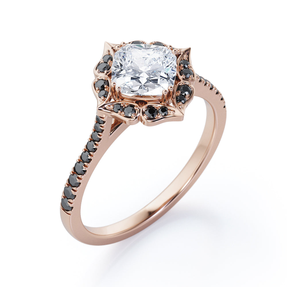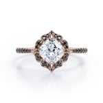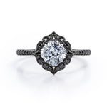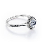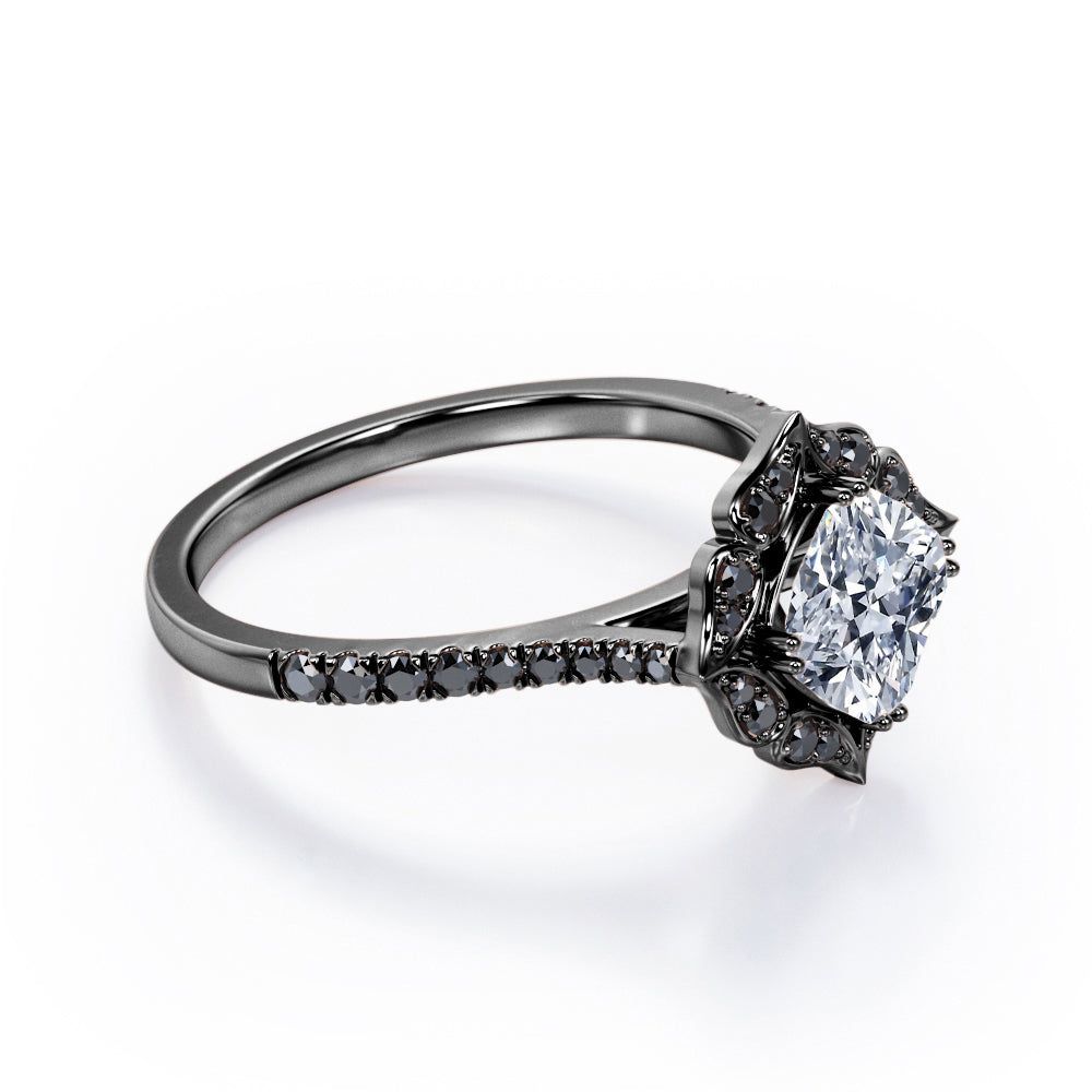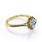 Make every day a cloud nine day with this Vintage Filigree Cluster 1.5 TCW Cushion Cut Moissanite with Lab Created Black Diamond Engagement Ring with Pave Accents in Yellow gold. Skillfully hand-cut into a nice cushion cut by our skilled jewelers, this splendid moissanite promise ring integrates total 1.5 carat moissanite and lab-created black diamonds. Special and non-traditional, this silver moissanite ring is perfect for those who would love to express their charisma and uniqueness. With naked eyes moissanites look, shine and feel exactly like diamonds. With its splendor, this near colorless moissanite ring will absolutely enhance every style of its wearer. This moissanite jewelry is beautiful and accessible since it is available at a reasonable price. Moissanites are the most popular alternative gemstone for diamonds while being at lower and more affordable price. If you are looking for a special gift for your friends or your better half, this moissanite anniversary band, the birthstone ring for the fourth month, symbolizing an unbreakable love and strength, will surely be the best choice. Also, this moissanite fine jewelry can be customized, either in White gold, rose gold, yellow gold or black gold in 18k Gold over Silver, 10k and 14k gold metal options upon customer request. In regards to its hardness, moissanite is almost as hard as diamond which means that it is notably durable. Let's fulfill your love story with this moissanite promise ring and, surely, she will not regret it.