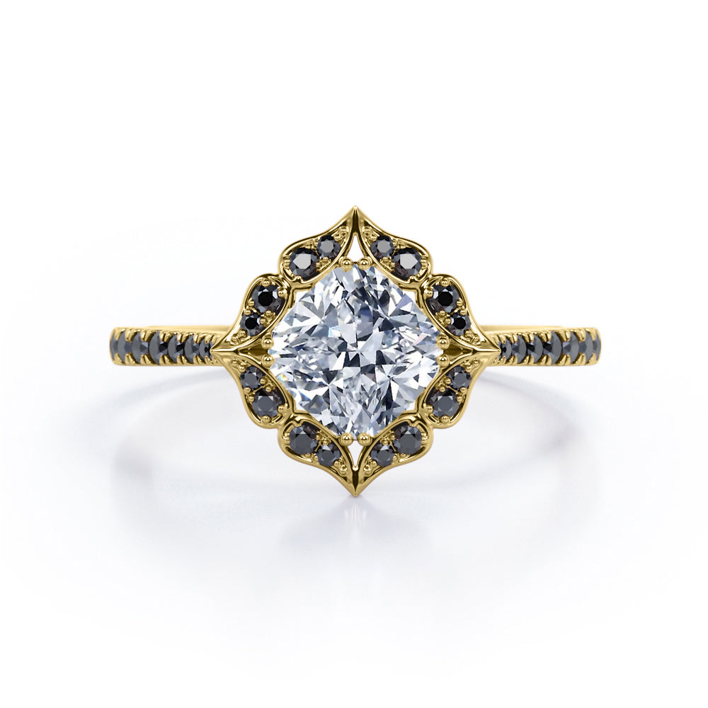 Vintage Filigree Cluster 1.5 TCW Cushion Cut Moissanite with Lab Created Black Diamond Engagement Ring with Pave Accents in Yellow Gold