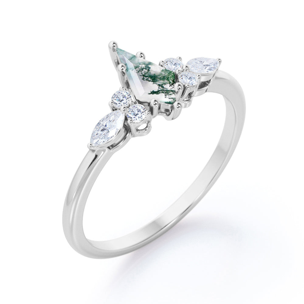 Healing and restoring your positive energy with Moss agate jewelry. Elegant 1 carat Kite Shaped Moss Agate and Moissanite Promise Ring in White Gold exudes 0.85 carat Moss agate and 0.15 carat Moissanite on the ring. Engagement ring presents step cut Moss agate as the center stone, it is delicately secured in 6 prongs. 18k gold over silver band is garnished with dazzling round and marquise Moissanite; 4 circles of Moissanite are located side by side with the center stone while marquise Moissanite is presented in an east-west setting next to round Moissanite. Side stone glistens and compliments an exceptional green Moss agate beautifully. Genuine Moss agate ring is not only perfect for a proposal but also one of the most considerate gift. You can embellish the important days of your love ones' like graduation, mother's day, new year, etc. The anniversary ring is available in rose gold, white gold, black gold and yellow with 2 metal options; 18k gold over silver, 10k gold, 14k gold, 18k gold. The ring comes with 30 days full refund policy and one free resizing within 30 days upon receipt of the item.