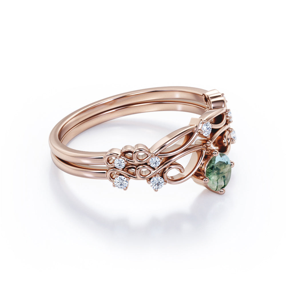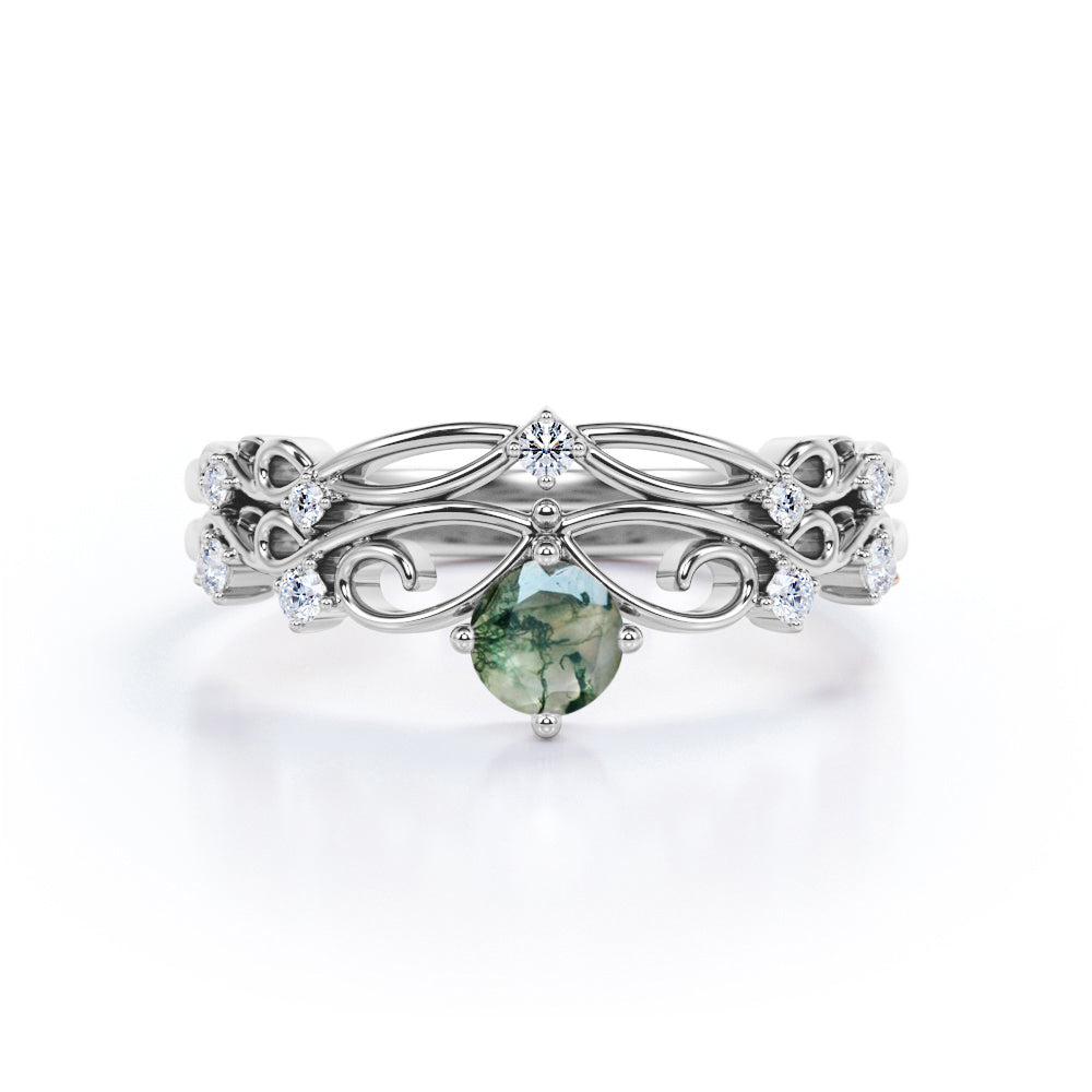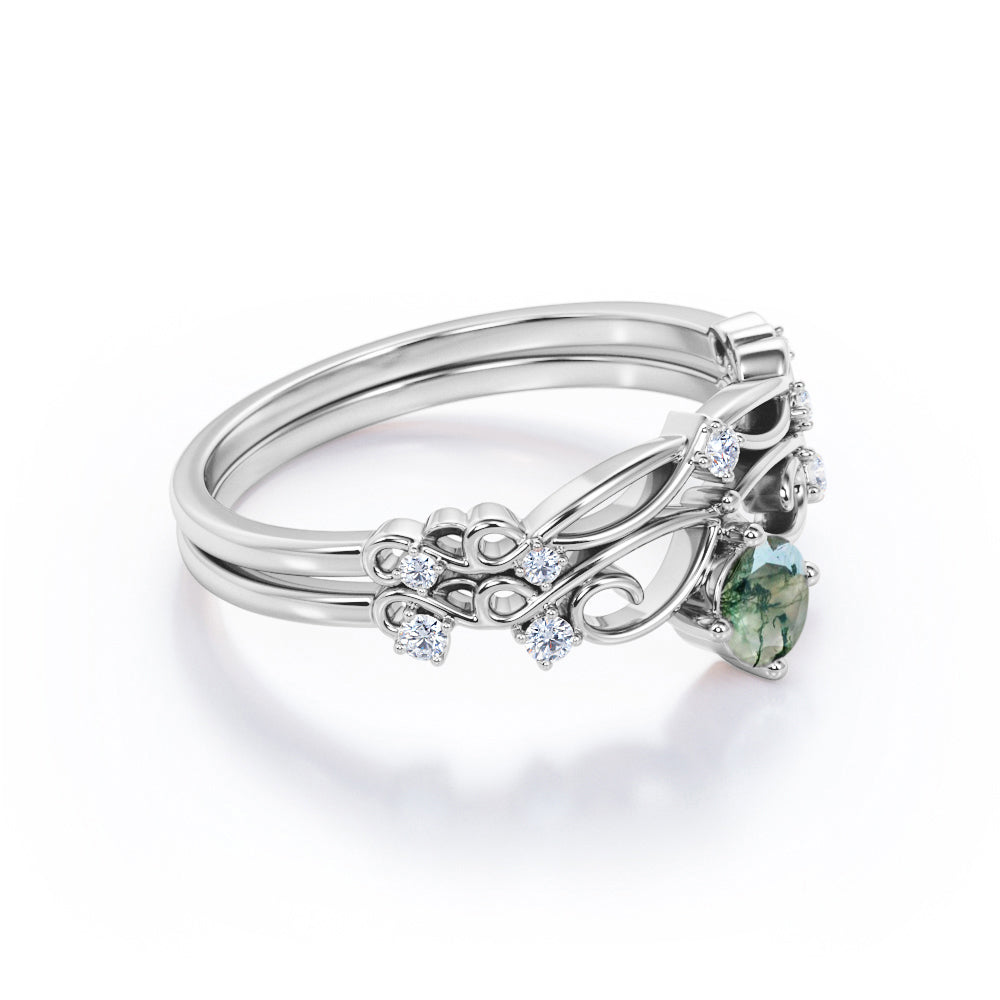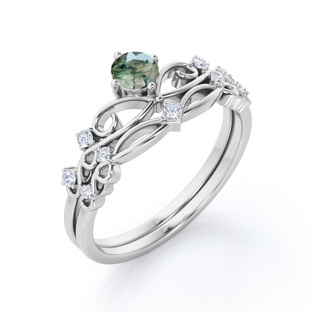 Matching Wedding Ring Set For Women 0.6 carat Round Moss Agate and Moissanite Rings in White Gold presents a very unique design and it contains 2 rings; moss agate engagement ring and matching wedding band. The Promise ring boast a 0.5 carat round moss agate stone while the band is artfully crafted into a scroll and looks like waves, reminding you the time that you lay by the beach and watching endless waves hit the shore. This open work moss agate ring is ornamented with dainty round Moissanite as well as the wedding band. Wedding ring features the same design with the engagement ring but has a final touch of Moissanite in the center instead of green agate crystal. The bridal set is available in the colors of white gold, rose gold, yellow gold and black gold. You can also select either 18k gold over silver, 10k gold or 14k gold per your satisfaction