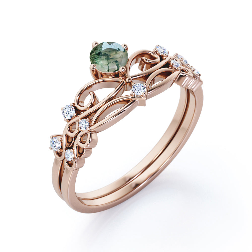 Art Deco 0.6 Carat Round Green Moss Agate Bridal Set