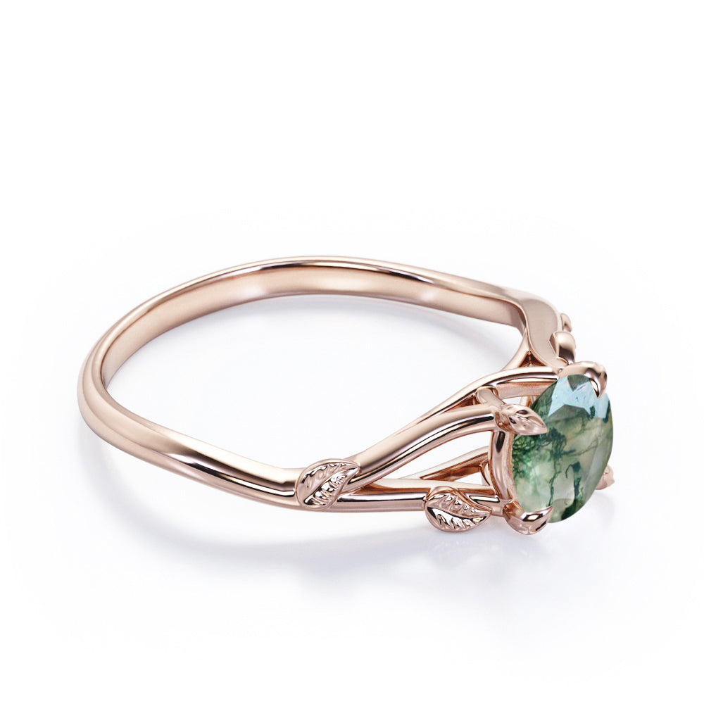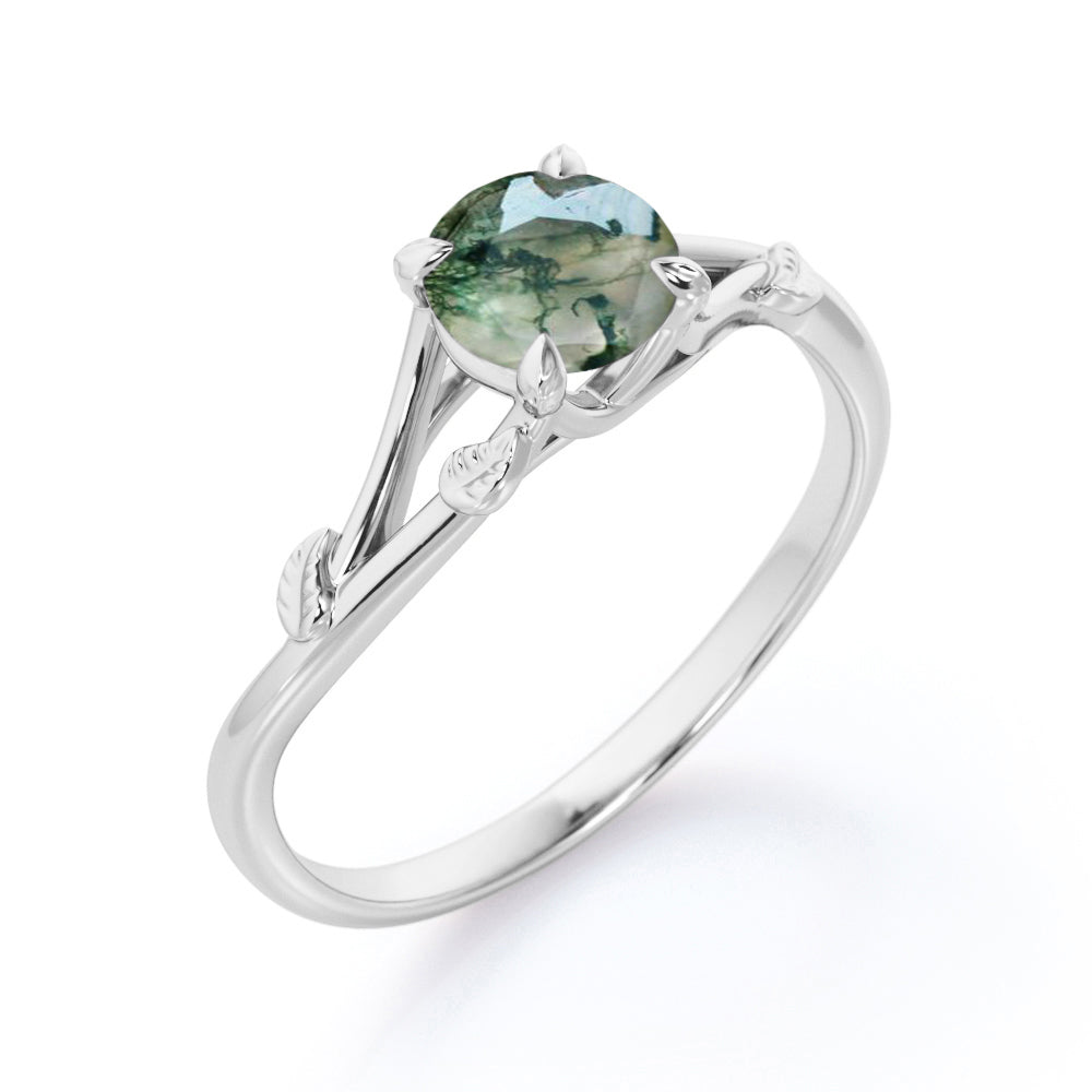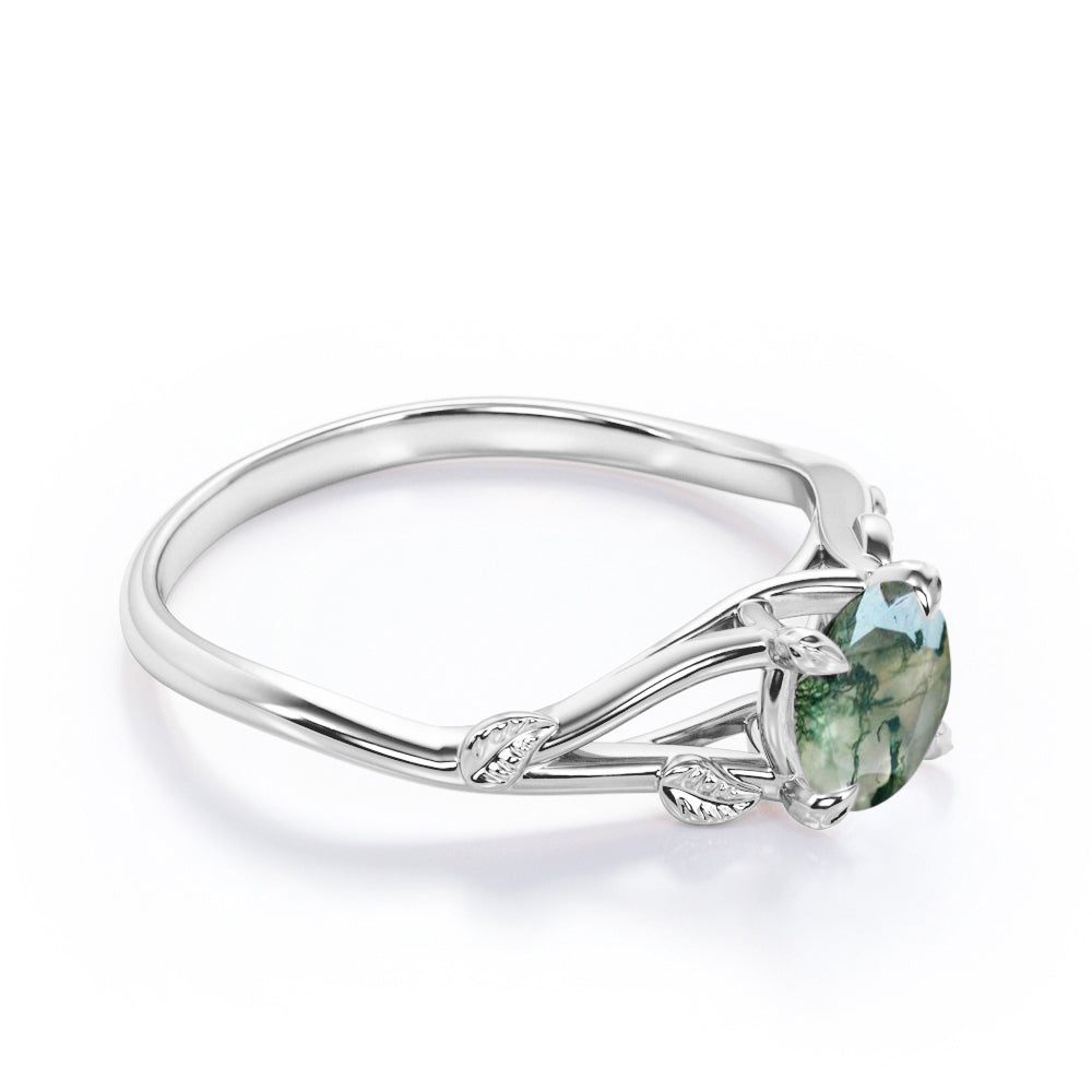 Twig but not twisted. The Nature lover's choice - 0.75 carat Round Moss agate Leaf Promise Ring in White Gold features 0.75 carat authentic moss agate. Split shanks are delicately polished and crafted in to leaf and vines design. The 2 bands are contoured and illustrate a connection between each other, which if you look from afar, you will see that green moss agate is held in branches that linked and formed into marquise shape like a heart of the forest. Moss agate is a healing stone that will restore a good force to you, it wipes out the bad energy and refresh it. Green color is embed within the stone and whenever you look at it, it will calm you and sooth your soul. Moss agate jewelry is a very popular jewelry because Moss Agate is also a stone of wealth and it attracts abundance in all forms so it a perfect choice for all people at all ages. Our natural Moss agate engagement ring is available at a very reasonable price and it can be customized in to 18k gold over silver, 10k gold, 14k gold, 18k gold and in the colors of white gold, rose gold, yellow gold and black gold.