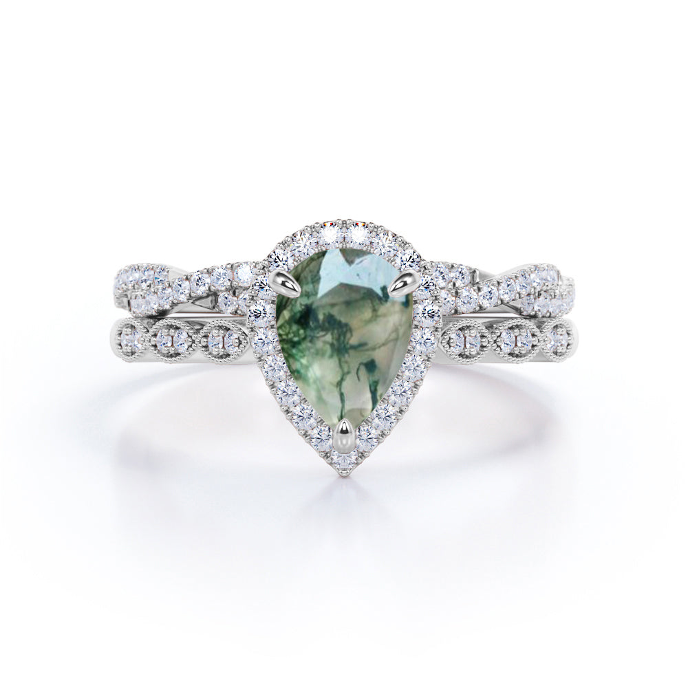 Pear cut or tear drop cut is one of the meaningful gift. The tear drop is believed to be a happy tears that you share with your special someone. This Scalloped band - 1.25 carat Pear Cut Moss Agate and Moissanite Bridal Set in White Gold features a 0.5 carat pear shape Moss agate and 0.75 carat Moissanite. The halo engagement ring contains pear shape Moss agate and Moissanite accent, the band display marquise shapes alternate with small rounds. Round brilliant Moissanite is housed within Milgrain shapes on the band. Twisted wedding band adds sparkle and pattern to its promise ring.
