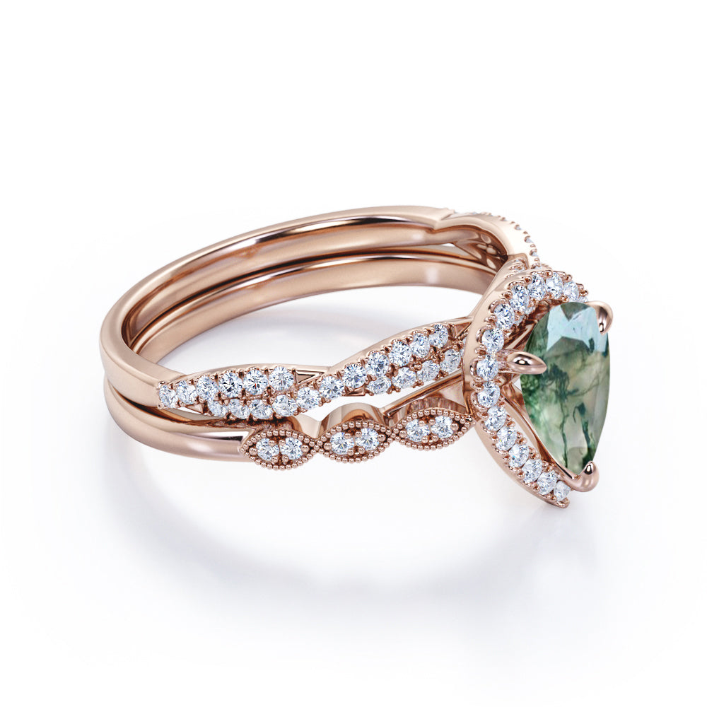 Scalloped Band 1.25 Carat Pear Cut Moss Agate Bridal Set