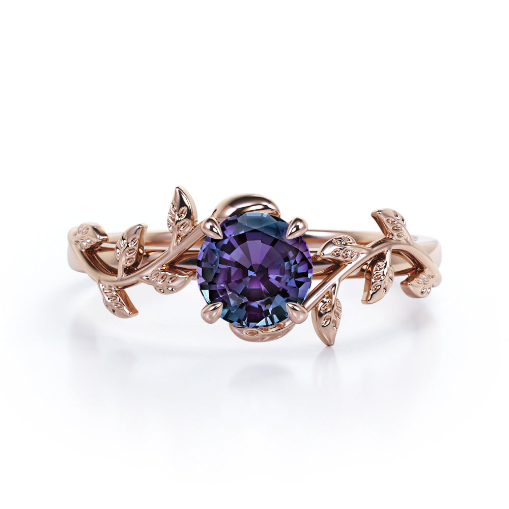 Floral Art Deco 1 Carat Round Cut Lab Created Alexandrite Nature Inspired Engagement Ring In White Gold For Her
