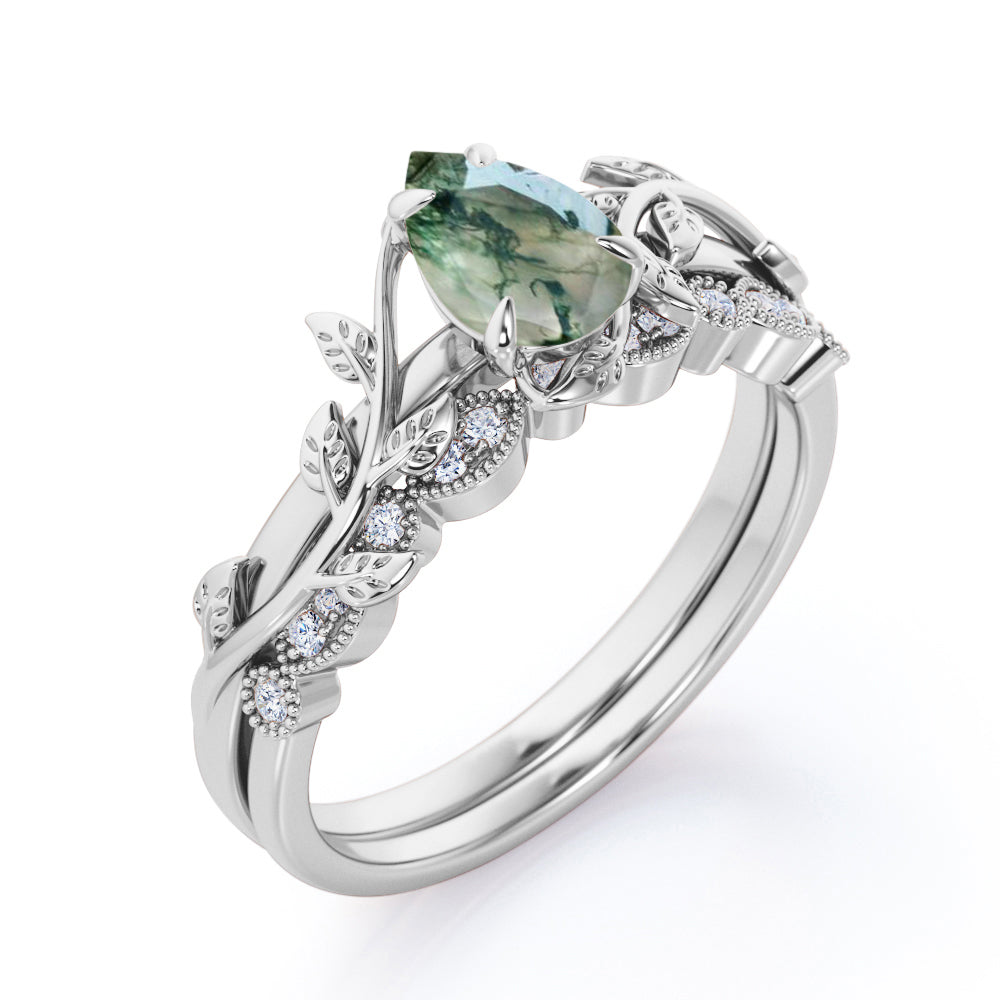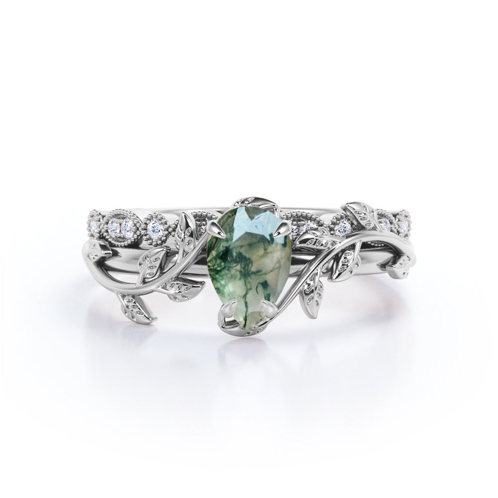 Step into a fairytale and portray your romantic love with this Stylish Branchlet 1.25 carat Pear Moss Agate and Moissanite Bridal Ring Set in White Gold. Natured-inspired wedding ring set features 2 rings of a 1 carat solitaire engagement ring and 0.25 carat Moissanite wedding band. Leaf and vine well-crafted band is curved and encrusting the pear shape authentic Moss agate. Each leaf is engraved that it makes the leaf looks more realistic. The wedding band is intricately made in to marquise and round shape, alternating on the band. Each shape holds dainty round Moissanite within and it is framed by Milgrain bead decor. Don't worry if your beloved one doesn't like white gold color, we offer white gold, rose gold, yellow gold and black gold so you can choose the color that matches her most. The metal can also be customized to 18k gold over silver. 10k gold, 14k gold and 18k gold.