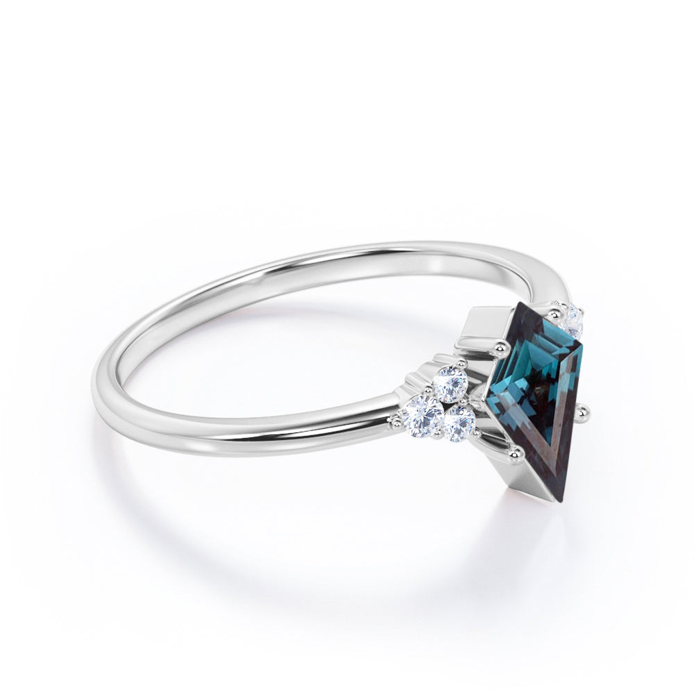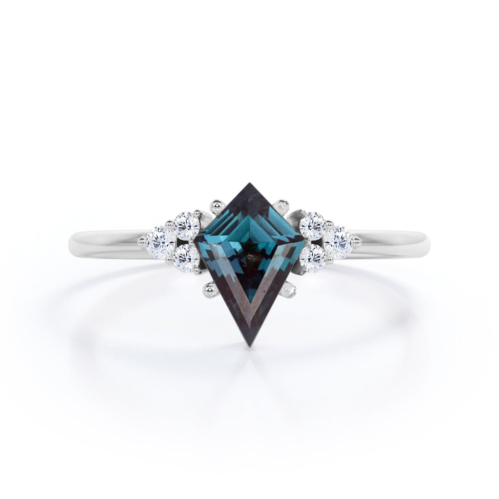 Unique Four Prong 1 Carat Kite Shaped Lab Created Alexandrite And Diamond Seven Stone Engagement Ring In White Gold. If your goal is an engagement ring that looks nothing like your traditional engagement ring, then this one is an ideal choice. Four prong set kite shaped diamond in a white gold plain shank looks classic, clean, and totally wedding-worthy. This seven stone ring features 0.85 carat lab made alexandrite at the center accompanied by three set of brilliant round cut diamonds of 0.15 on either side making this an exceptional piece of art. This unique four prong 1 carat kite shaped lab created alexandrite and diamond seven stone engagement ring in white gold can also be customized in 18k Gold plating over silver, 10k Gold or 14k Gold depending upon your choice. Grab it now before it gets sold out.