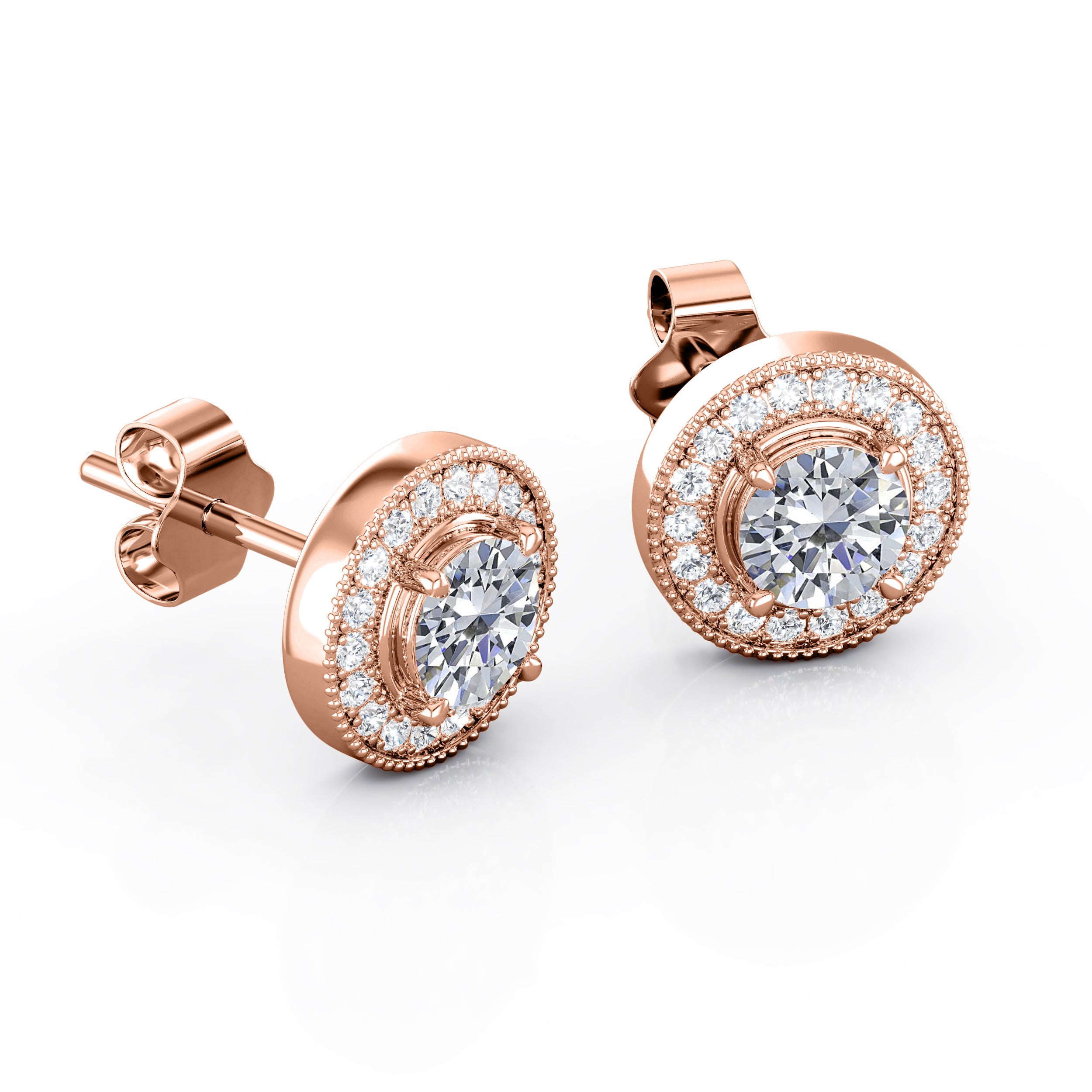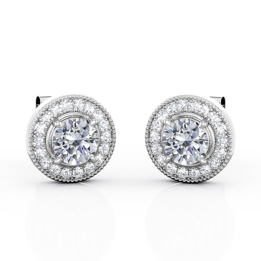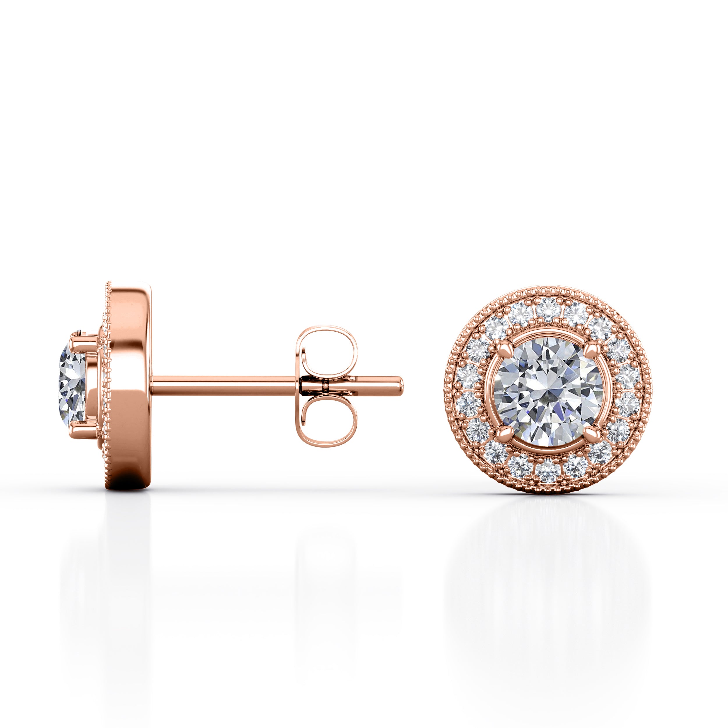 Half Bezel Set 1.70 Carat Round Cut Certified Moissanite and Diamond Surface Prong Edwardian Stud Earrings in Rose Gold