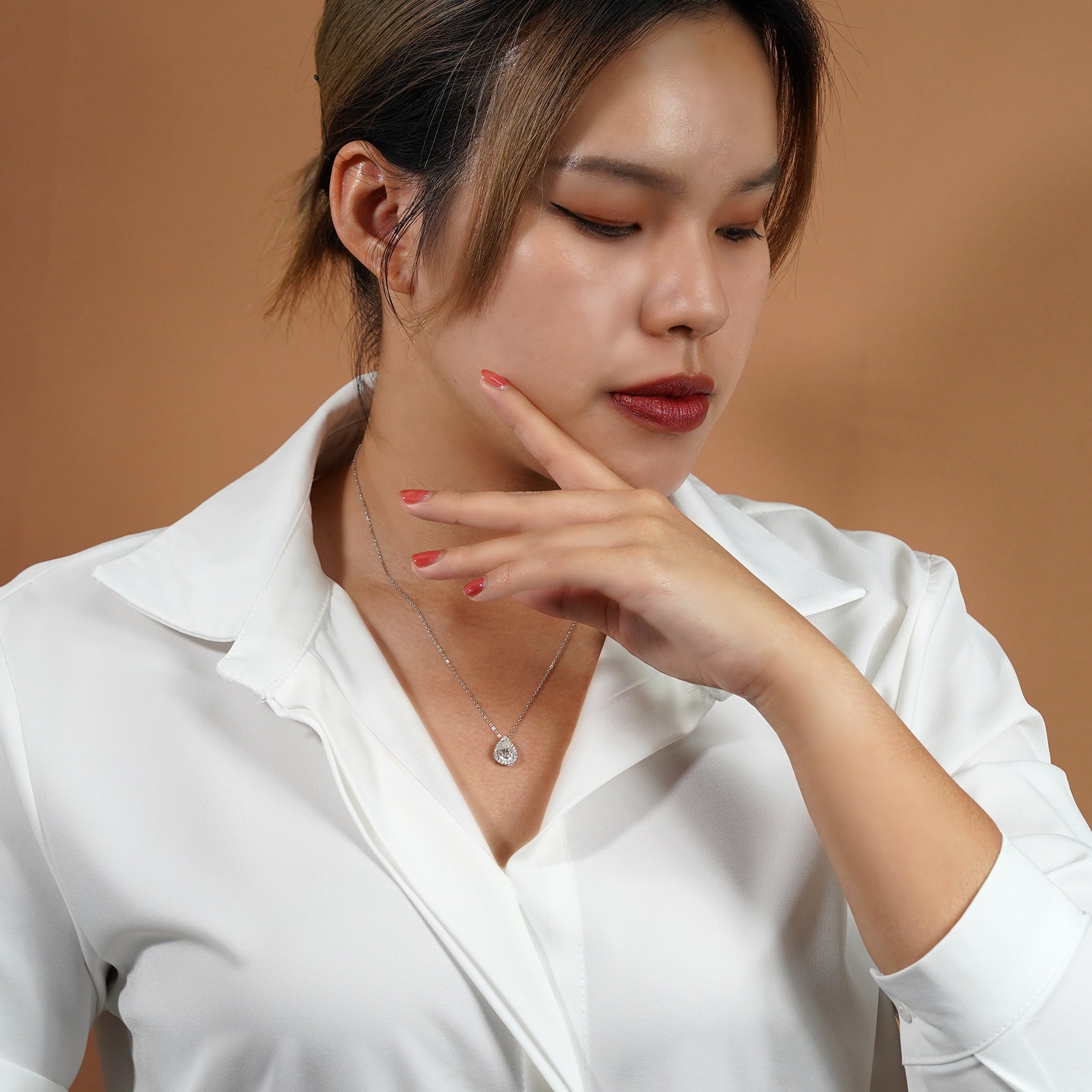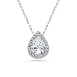 Capture all attention with our 1 TCW Pear Shaped Moissanite - Halo - Slider Pendant Necklace in 18K White Gold over Silver. This solitaire pendant necklace showcases an elegant 1 carat pear-shaped Moissanite stone surrounded by a dazzling halo contributing to a total carat weight of 1.1 carat. With its silver slide design, the moissanite jewelry pendant is also able to move along the chain as you move. As the pear halo pendant features a unique and elegant design, the classic pendant necklace will prove to be a versatile accessory that complements every one of your ensembles.