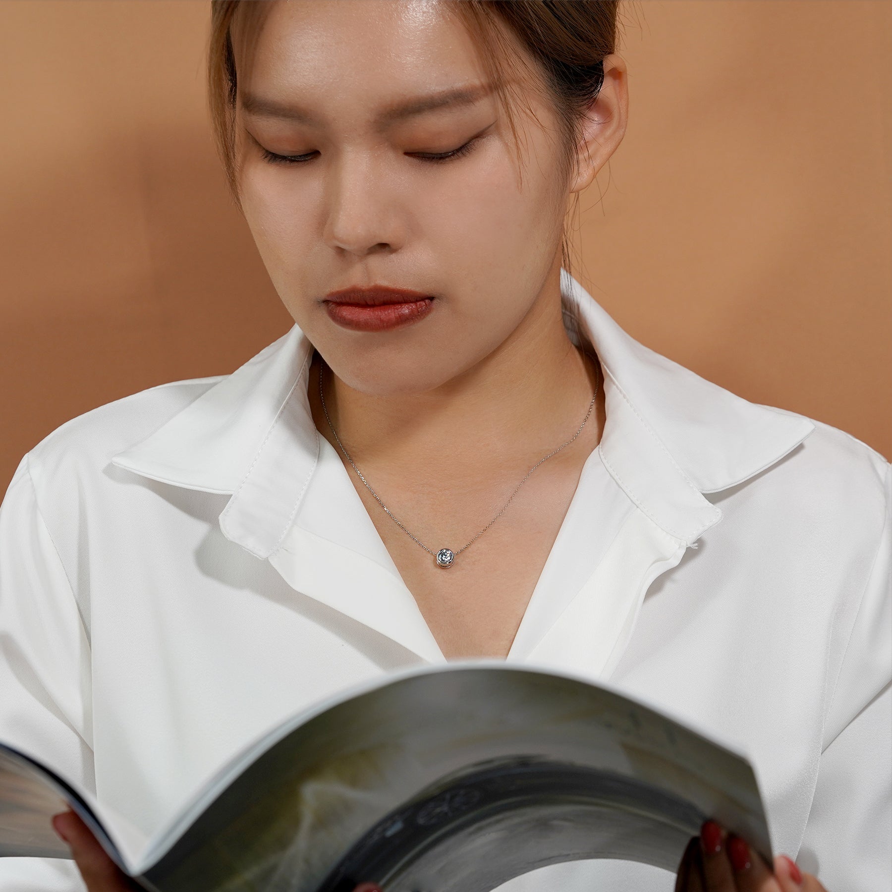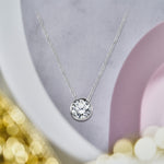 Discover affordable luxury with our Modern 1 Carat Round Cut Moissanite Bezel Set Slider Pendant Necklace in 18K White Gold over Silver. This round circle pendant necklace effortlessly blends timeless elegance with affordability and uniqueness. The slide necklace pendant features a brilliant 1 carat round cut Moissanite stone in bezel Not only does it provide security, but the bezel pendant setting also adds a touch of classic charm to the classic pendant necklace. The pendant bezel slides gracefully along a sterling silver chain, allowing you to customize the length to suit your style. Our pendant necklace sterling silver offers the best of both worlds: the opulence of 18K white gold over silver and the timeless appeal of a classic pendant design.