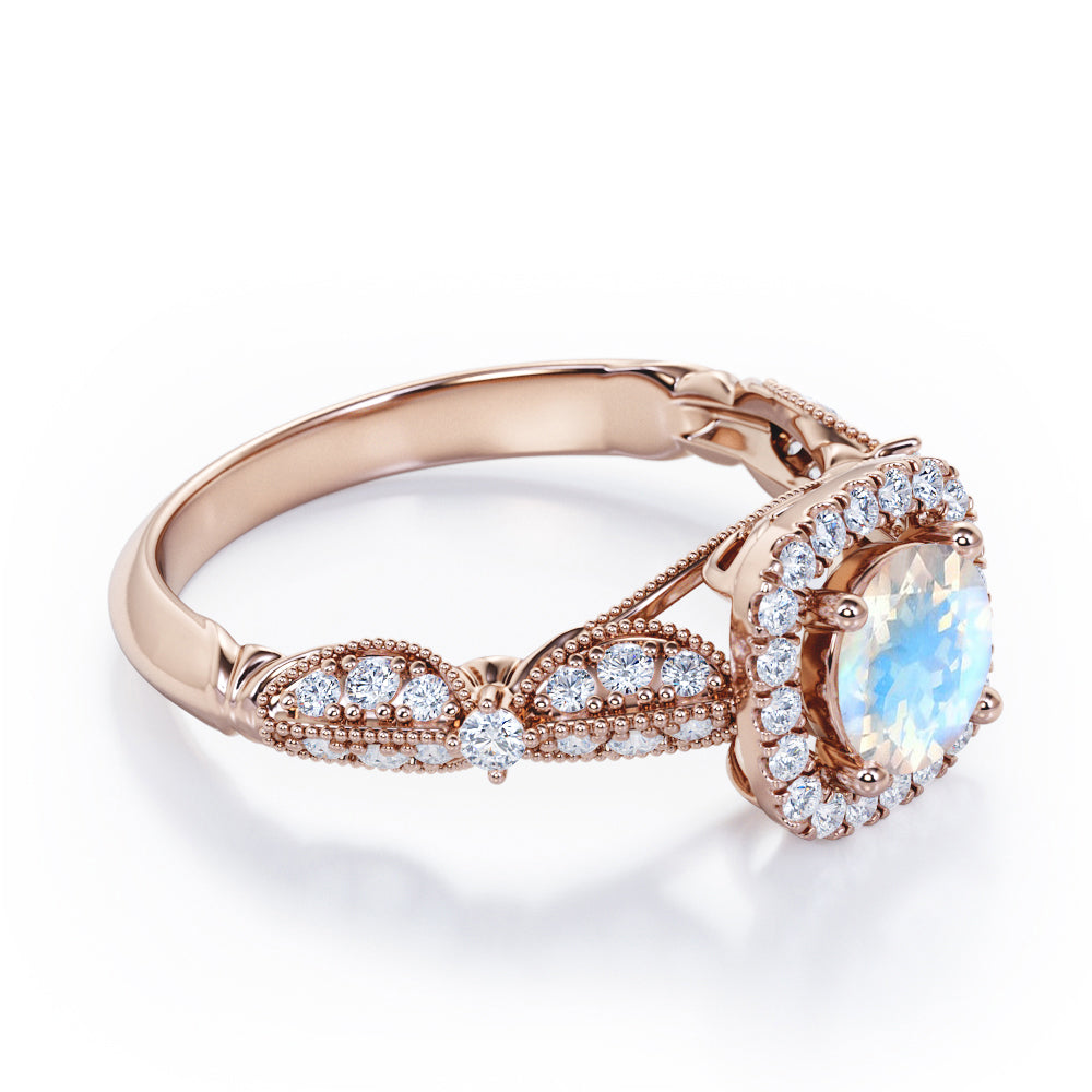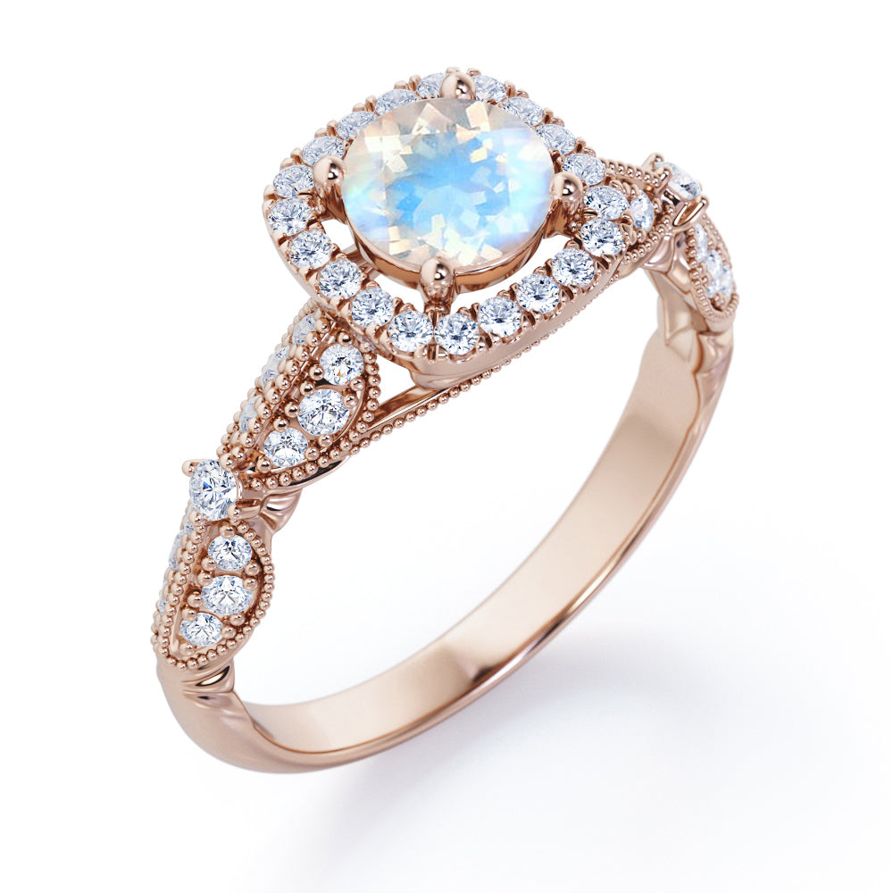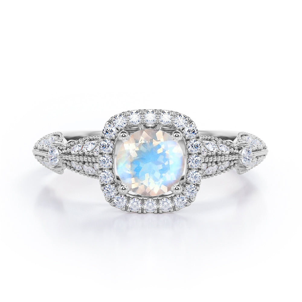 Antique Milgrain 1.35 Carat Round Cut Moonstone And Diamond Halo Engagement Ring In White Gold. If you're in search of an antique engagement ring that feels one-of-a-kind but isn't too expensive, then you really can't go wrong with this moonstone and diamond engagement ring. This vintage ring features one carat round cut moonstone as the center stone which sits in a halo of white sizzling diamonds of 0.35 carat in a white gold band. The beaded work on the band is highly commendable job of our craftsmen which adds that antique vibes on this ring. The center moonstone radiates its own jewel tones which will definitely create a magical look in your fingers. This antique milgrain 1.35 carat round cut moonstone and diamond halo engagement ring in white gold can also be customized to 18k Gold plating over silver, 10k Gold or 14k Gold as per your preference. Please note that if the ring is made over silver, the side stone will be moissanite and if it is made on gold, diamond will be employed as the side stone.