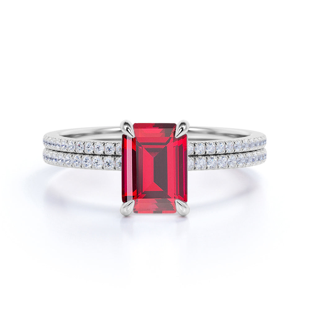 1.50 Carat Emerald Cut Genuine Ruby Wedding Set - Classic Ring Band - 18k White Gold over Silver