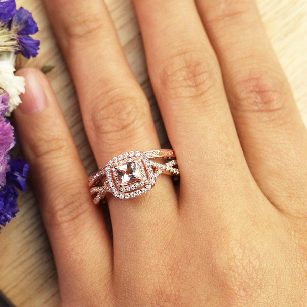 1.5 Carat Princess Cut created morganite Wedding Set - Bridal Set - Wedding Trio Set - Infinity Ring- 18k Rose Gold Over Silver. Express all the love you hold in your heart with this irresistible 1.5 Carat Princess Cut created Morganite Wedding Set in 18k Rose Gold Over Silver. The engagement ring is made with created and created peach pink morganite, high quality zirconium, and 18k gold plating over silver. To accompany your vows, a matching infinity wedding band completes this beautiful look. As always, the order comes with 30 days full refund policy.