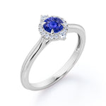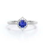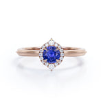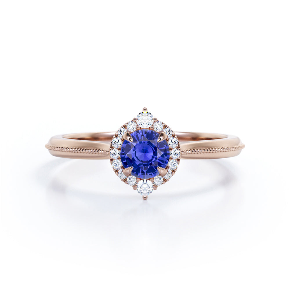 Experience the vintage elegance of our Petite Milgrain 0.70 carat Round Cut Lab-Created Sapphire and Diamond Halo Engagement ring in Rose Gold. Meticulously handcrafted, this ring features intricate milgrain detailing and a captivating halo design, showcasing a brilliant round-cut lab-created Sapphire. We take pride in creating affordable handmade jewelry, ensuring that luxury can be accessible without compromising on quality. Choose from a range of metal colors, including white gold, rose gold, yellow gold, and black gold in silver, allowing you to customize this ring to match your personal style and preference. Available in silver, 10k gold, and 14k gold metal variants, each meticulously crafted for durability and exceptional craftsmanship. The side stones of this enchanting ring vary based on the metal variant. The silver metal variant boasts shimmering moissanite side stones, while the 10k and 14k solid gold metal variants feature dazzling diamond side stones. This exquisite detailing adds an extra touch of sparkle and brilliance, enhancing the allure of the central Sapphire. Indulge in the beauty of our vintage halo Lab-Created Sapphire and Diamond Halo Engagement ring in Rose Gold—a timeless symbol of love and sophistication that will capture hearts for generations to come.