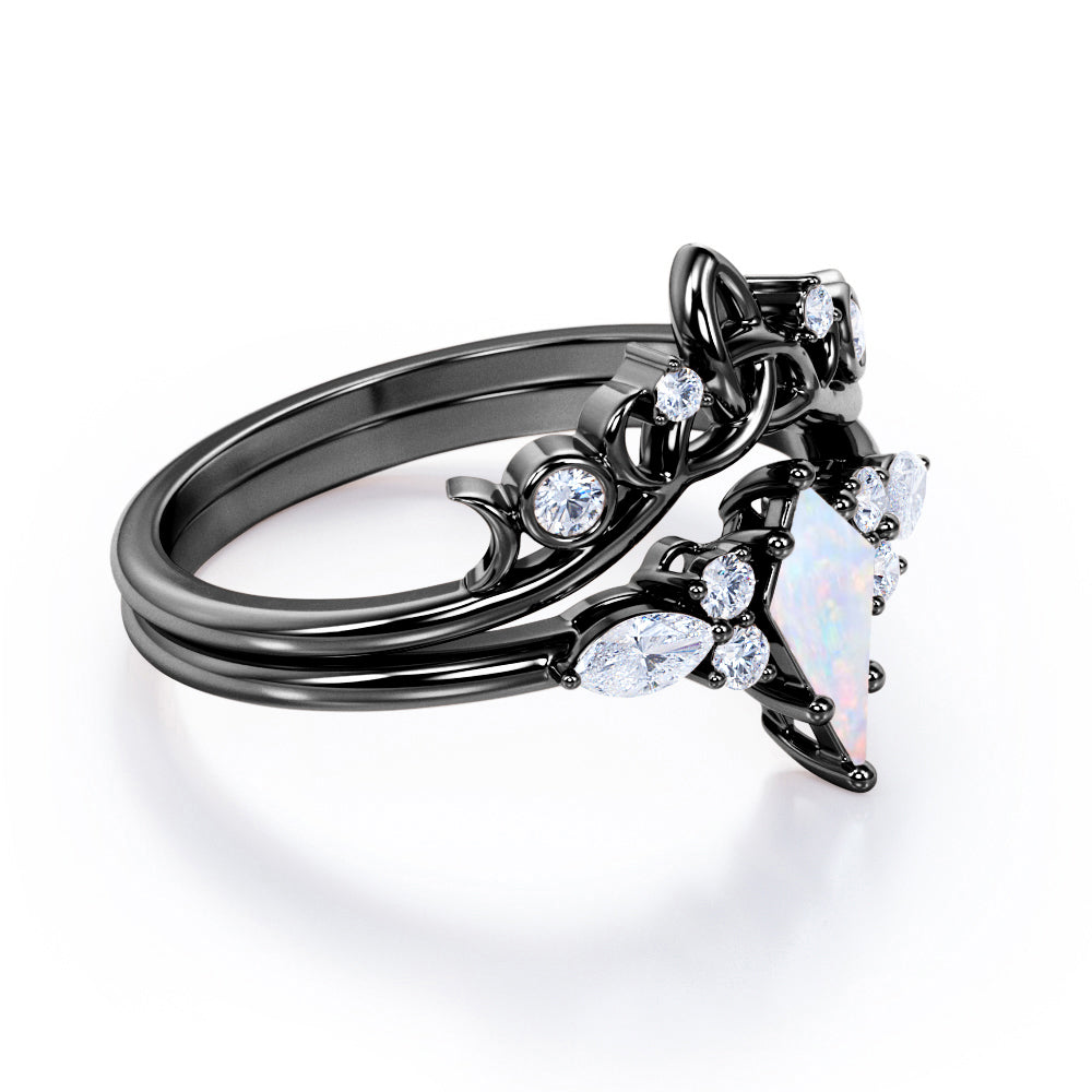 Asymmetric 1 Carat Kite Shaped Ethiopian Lab Created Opal and diamond Seven Stone Tiara Style Wedding Ring Set In Black Gold. This one is for the bold bride seeking something unconventional. Almost 1 carats of light Lab Created Opal and white diamond sits upon this black gold band in a strikingly unique design. This seven stone wedding ring set comprises of an engagement ring and a matching wedding band to complete your ensemble. The engagement ring features 0.85 carat solitaire Lab Created Opal as the center stone which is held by six prongs and surrounded by three set of diamonds on wither side making it a seven stone engagement ring. The matching wedding band is V shaped and completely unique on it's own. The white diamonds of 0.15 carat on this amazing bridal set shines brilliantly set on a plain black gold band. Handmade with sincere dedication, this asymmetric 1 carat kite shaped Ethiopian Lab Created Opal and diamond seven stone tiara style wedding ring set in white gold can also be customized to 18k Gold plating over silver, 10k Gold or 14k Gold as per your wish.