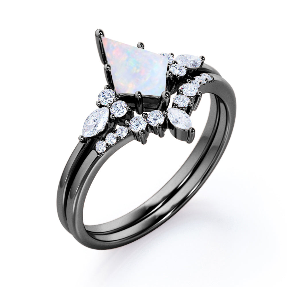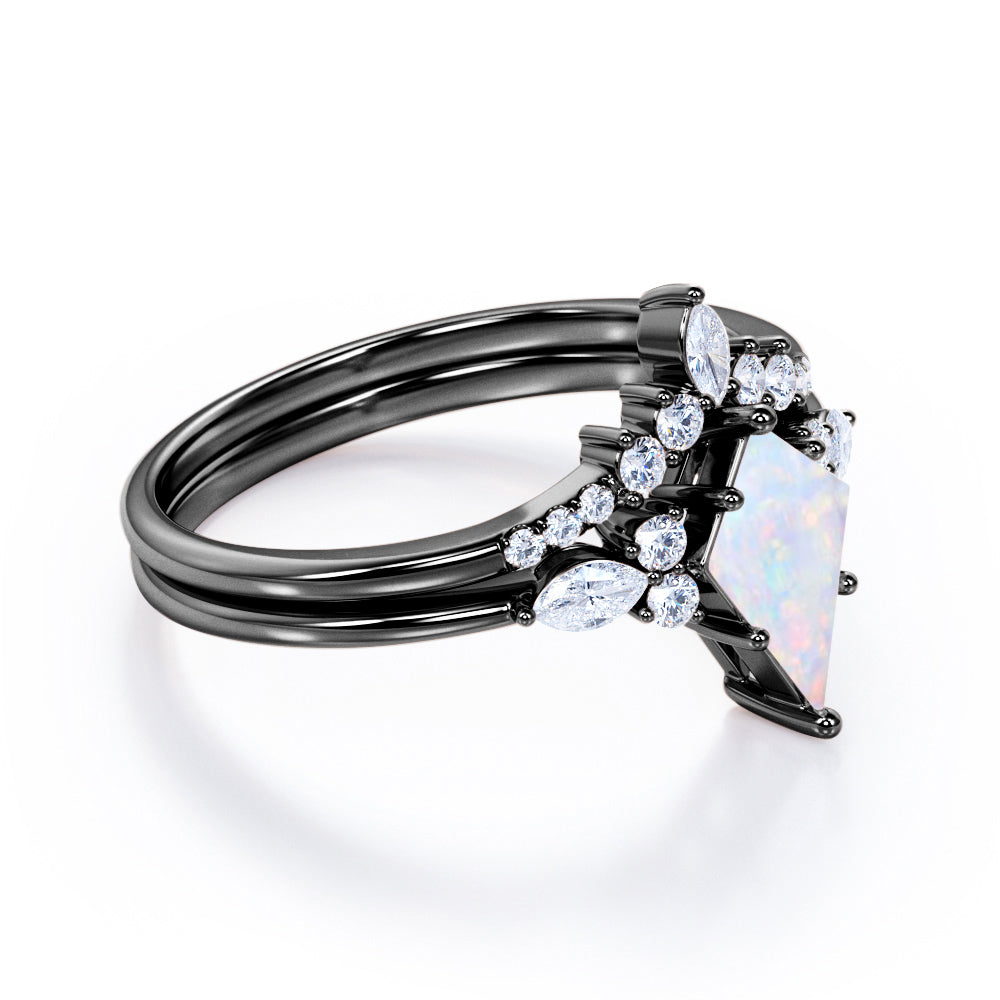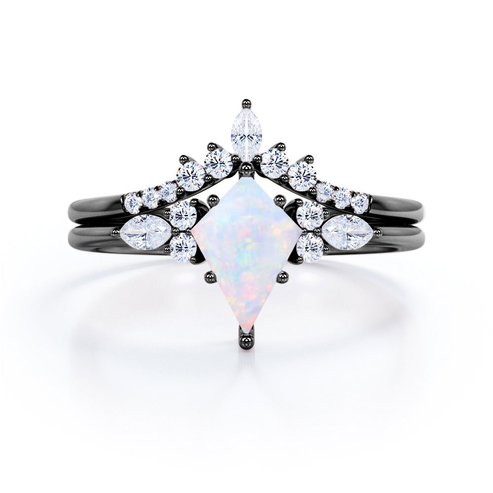 Crown design Six Prong 1.25 Carat Kite Shaped Lab Created Opal And Diamond Seven stone Bridal Set In Black Gold. For the brides looking for something very non-traditional, this ring is the perfect choice to go for. Not only do the bands of this ring give a timeless aesthetic, but the Lab Created Opal stone also makes the entire ring saturated in color. The kite shaped engagement ring is set with a Lab Created Opal center stone and six small diamonds of marquise and round shape throughout the band. This seven stone bridal set compiles of an engagement ring and a matching wedding band that complements each other perfectly. This unique bridal set features 0.85 carat Lab Created Opal as the center stone which is set on a basket setting and six prongs along with the side white diamond stones of 0.25 carat inclusive of the matching crown style wedding band. This crown design six prong 1.25 carat kite shaped Lab Created Opal and diamond seven stone bridal set in black gold can also be customized to 18k Gold plating over silver, 10k Gold or 14k Gold as per your choice.