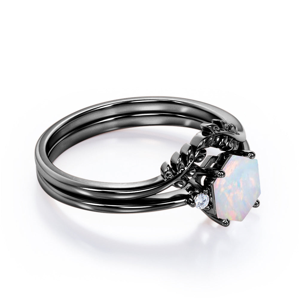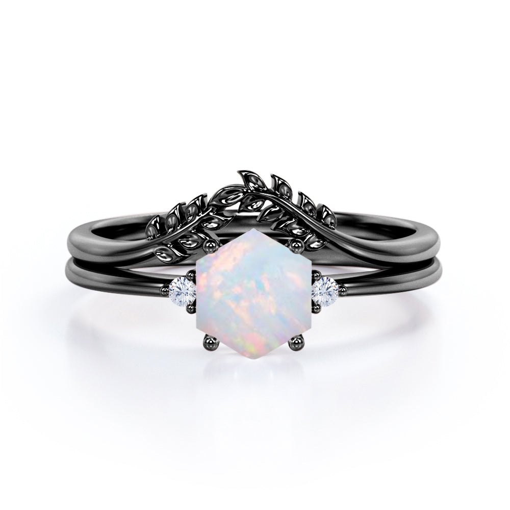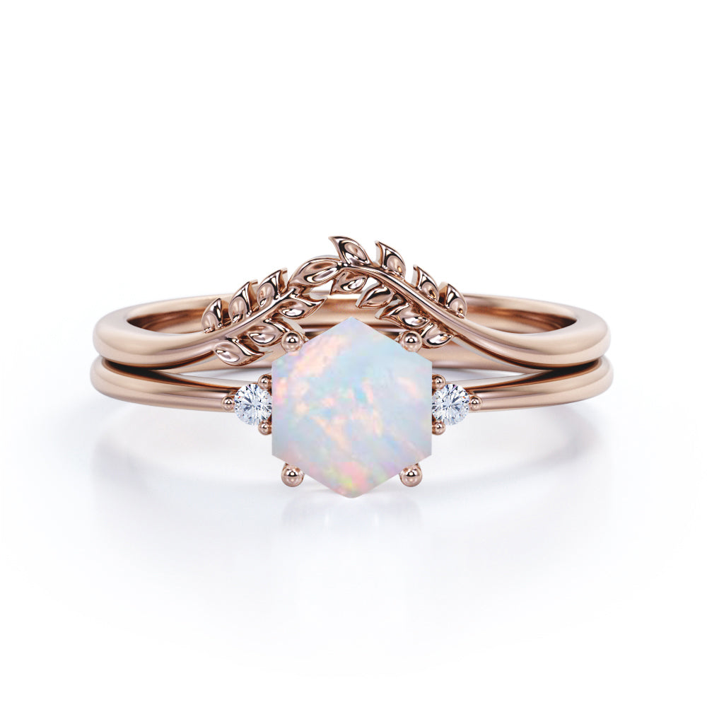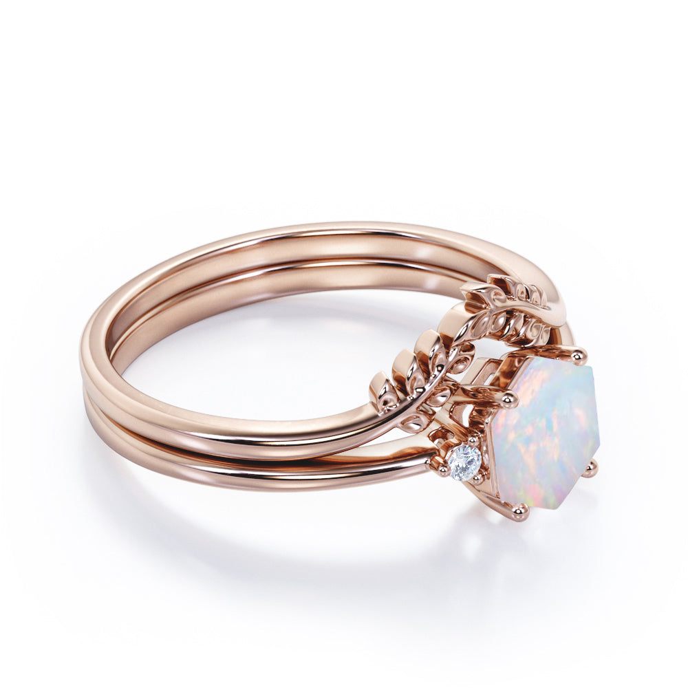 0.55 Ct Hexagon Cut Lab Created Opal Leaf Wedding Ring Set