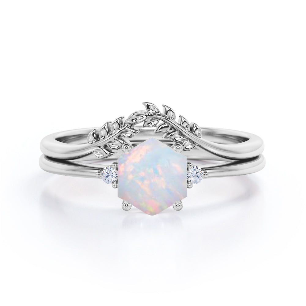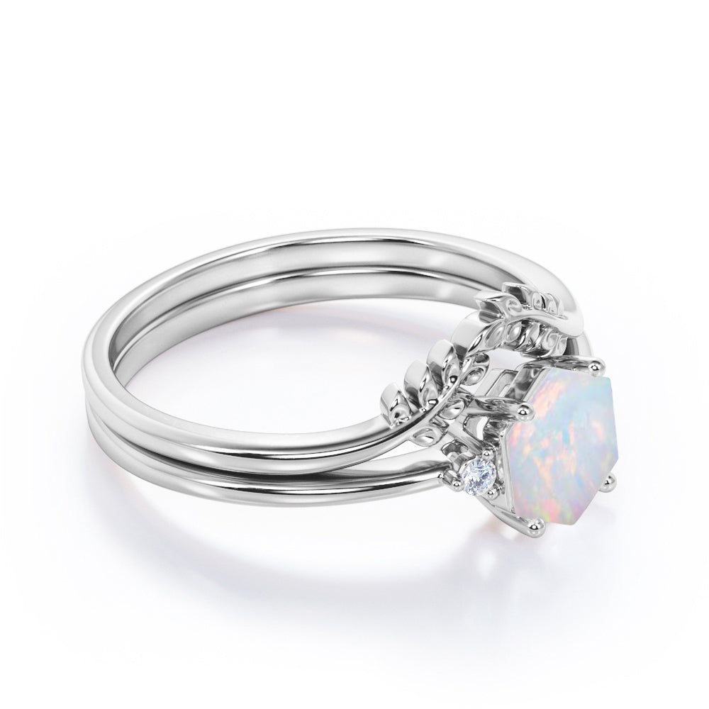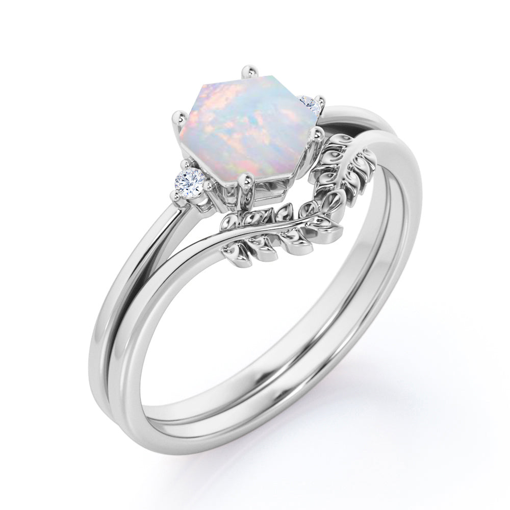 Leaf Style Four Prong 0.55 Carat Hexagon Shaped Fire Lab Created Opal And Diamond Nature Inspired Three Stone Wedding Ring Set In White Gold. You can't deny the wondrous beauty within an Lab Created Opal and each Lab Created Opal is truly one-of-a-kind which is fitting for the one-of-a-kind bride. This stunner is bursting with a kaleidoscopic array of colors. The minimalist design lets the beauty of the gemstone take the center stage. Reflect on your past, present, and future as a couple with this triplet ring. This nature inspired wedding ring set featuring a hexagon shaped Lab Created Opal looks like a precious heirloom and has a distinct one-of-a-kind feel to it. 0.5 carat hexagon cut Lab Created Opal center stone is held by four prongs in a basket setting and 0.05 carat petite round white diamond surrounds it from either side in a plain white gold band. This bridal set also comes with a matching wedding band which has floral leaf vine art details on it. This leaf style four prong 0.55 carat hexagon shaped fire Lab Created Opal and diamond nature inspired three stone wedding ring set in white gold can also be customized to 18k Gold plating over silver, 10k Gold or 14k Gold as you desire.