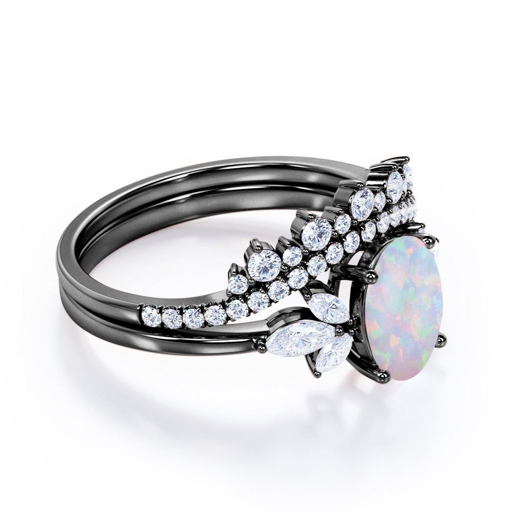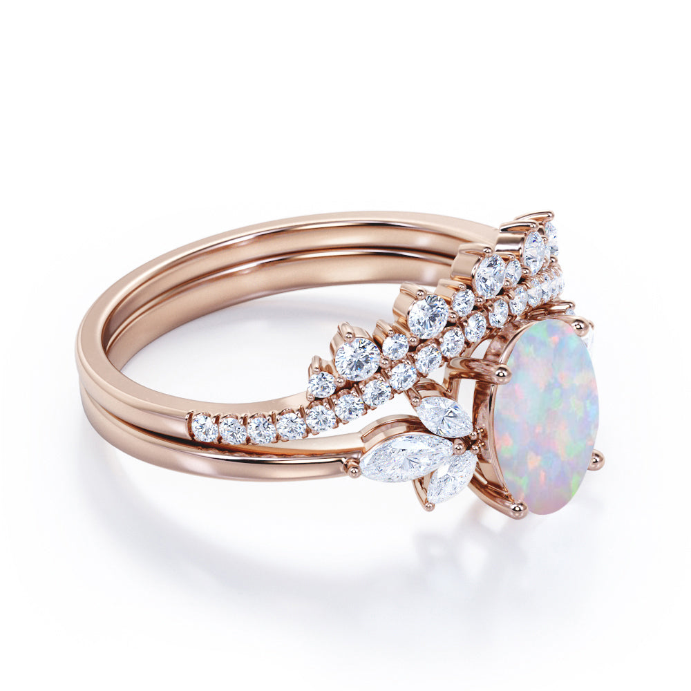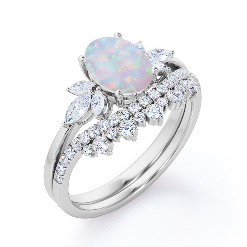 Seven Stone 1.75 Carat Oval Cut Genuine Lab Created Opal And Diamond Leaf Décor Pave Bridal Set In White Gold. Make an impact with this Lab Created Opal and diamond engagement ring that demands attention. A striking oval cut Lab Created Opal center stone diamond is framed by six marquise cut white diamonds on either side. This seven stone wedding ring set features an engagement ring with 1.30 carat Lab Created Opal and 0.45 carat white diamonds inclusive of the matching wedding band. Pave set diamonds sparkle on the white gold band. The four prong holds the solitaire Lab Created Opal stone on a basket setting letting it to shine on its own and the leaf like decor adds just extra elegance to this bridal set. Since all our rings are handmade by our experienced artisans with love and care, this seven stone 1.75 carat oval cut genuine Lab Created Opal and diamond leaf decor pave bridal set in white gold can also be customized to 18k Gold plating over silver, 10k Gold or 14k Gold as you prefer.